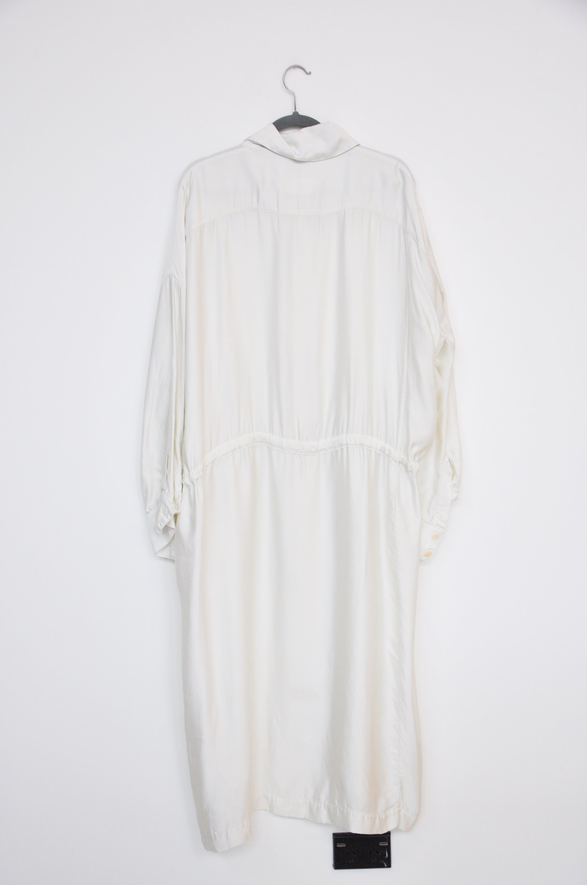Long-sleeved, off-white button down shirt dress. This dress has a collar, full-length button placket, and a drawstring tie at the waist that creates a gathered effect. It has two large pockets at the front. By the brand Miss Crab.