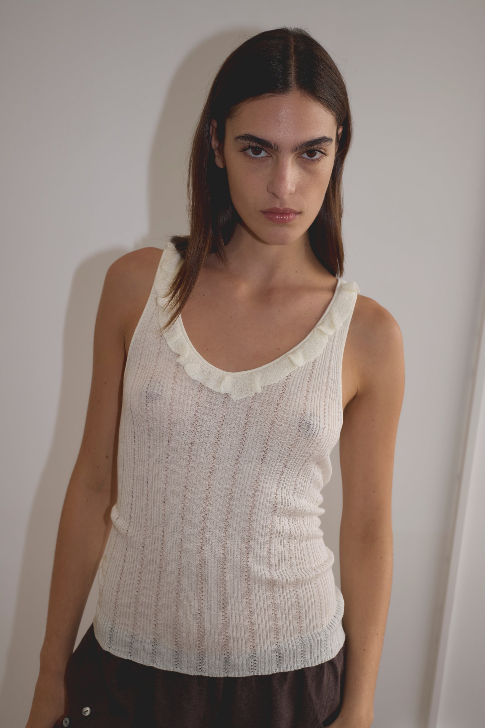 Neck Ruffle Knit in White, a sheer ribbed fine knit tank in a form-fitting silhouette, featuring a softly curved v neckline with delicate ruffle detail and babylock hem finish made from 90% ecoviscose, 10% linen