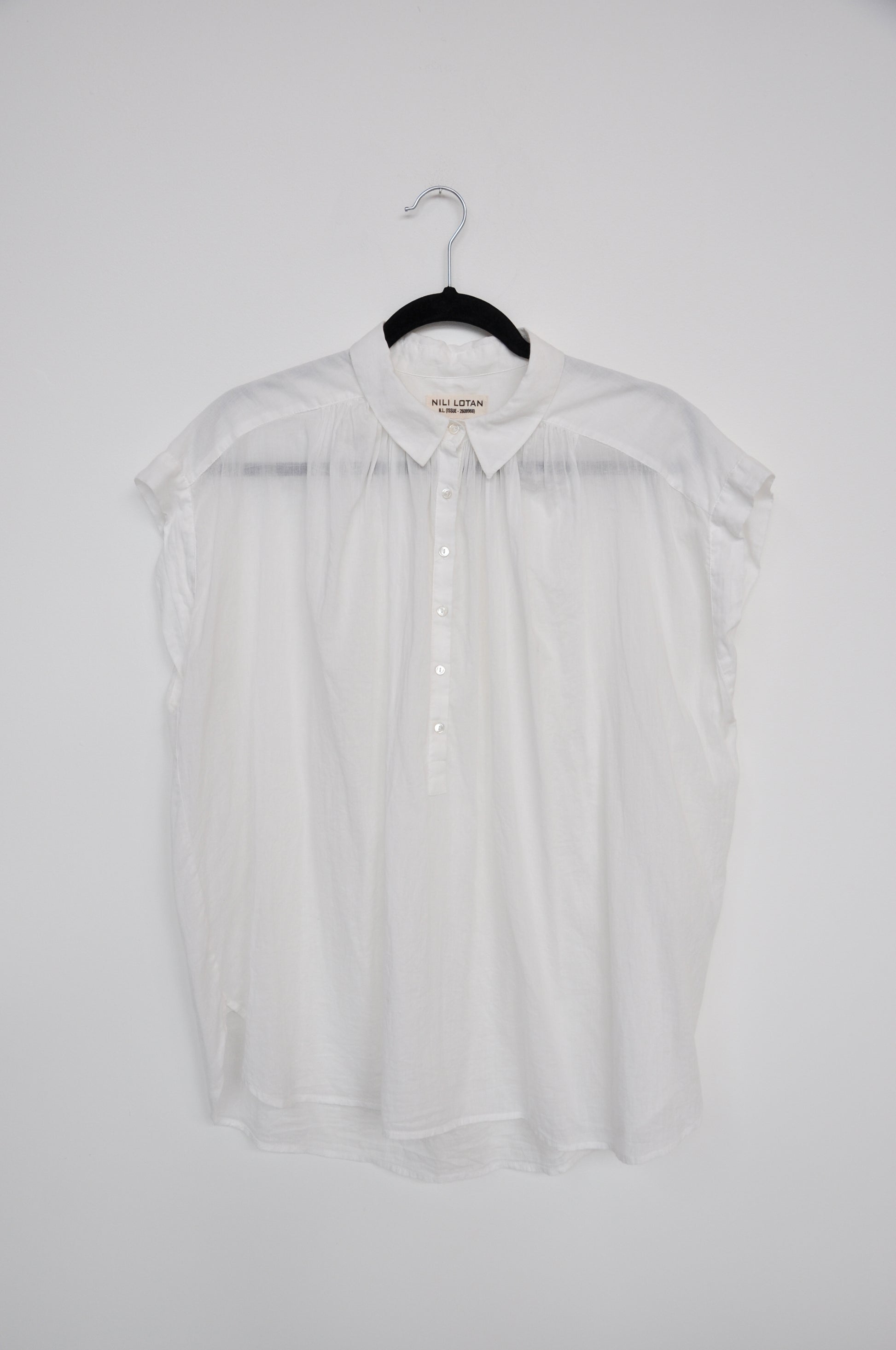Sleeveless sheer shirt. Pleated with a classic collar and a partial button- down placket. It has a loose, oversized fit. features a gathered neckline and curved hem.