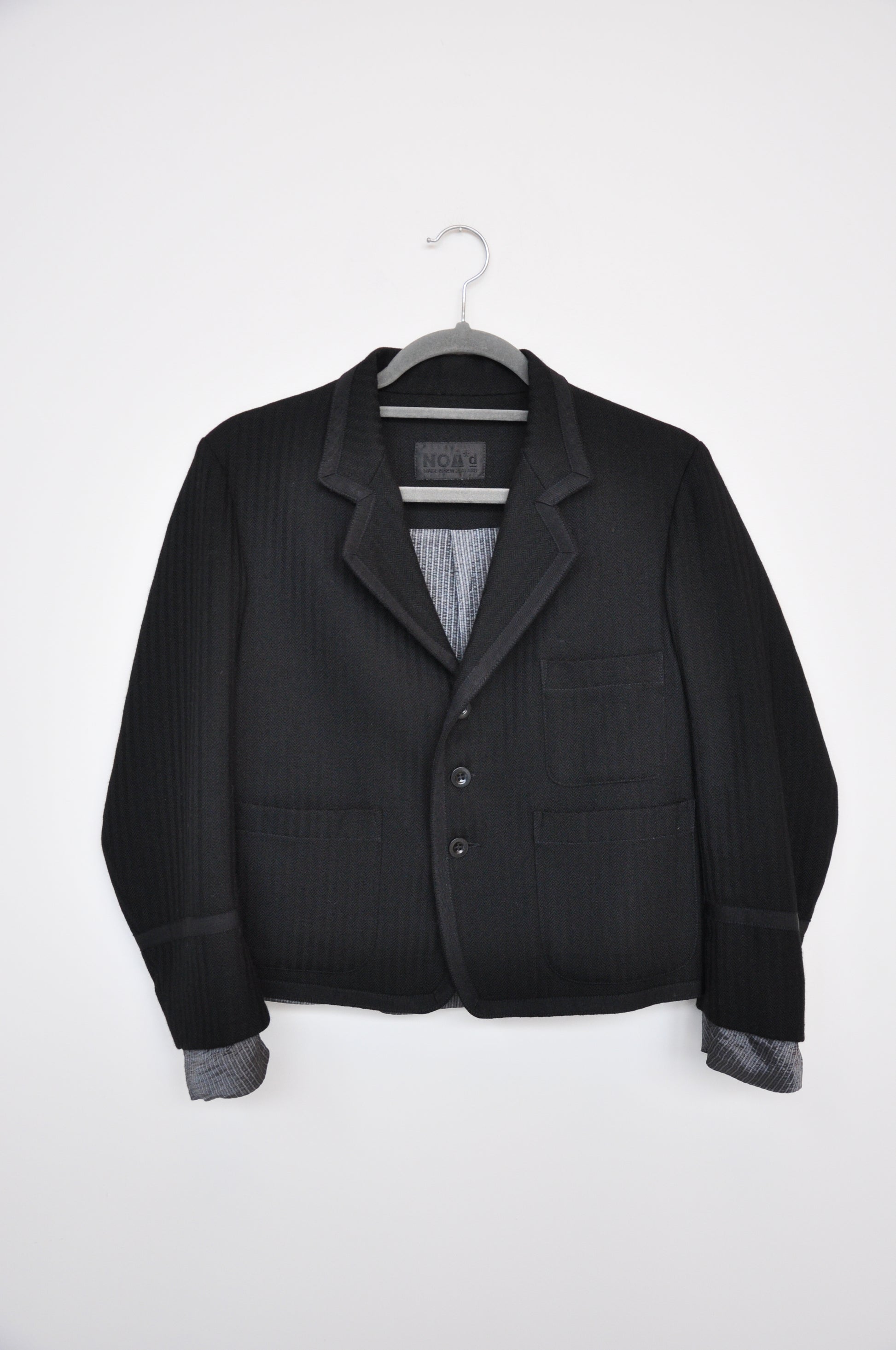 A classic notched lapel. Three-button front closure. Three prominent patch pockets with rounded bottoms on the front: at the lower hips and one on the left chest. A visible lining at the cuffs. Lined with a pinstripe pattern. By the brand Nom D.