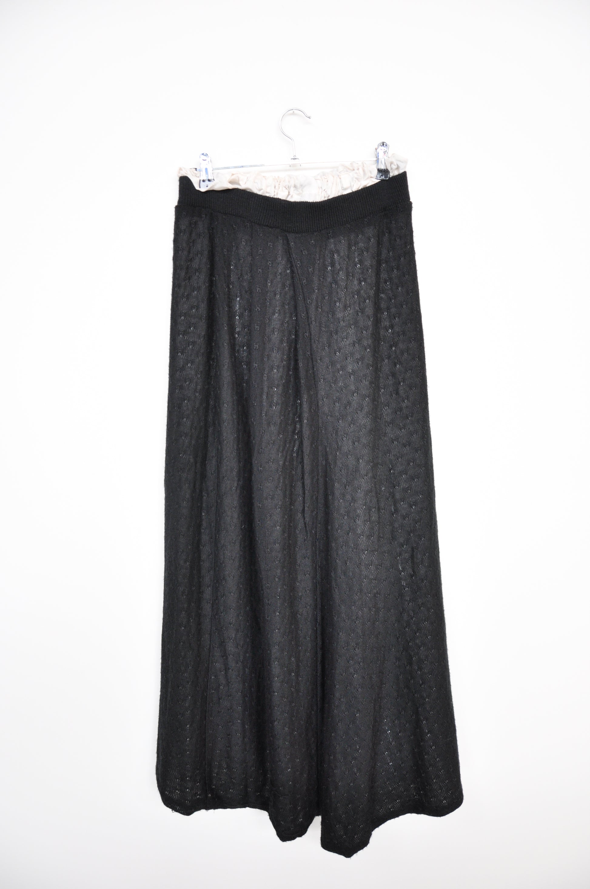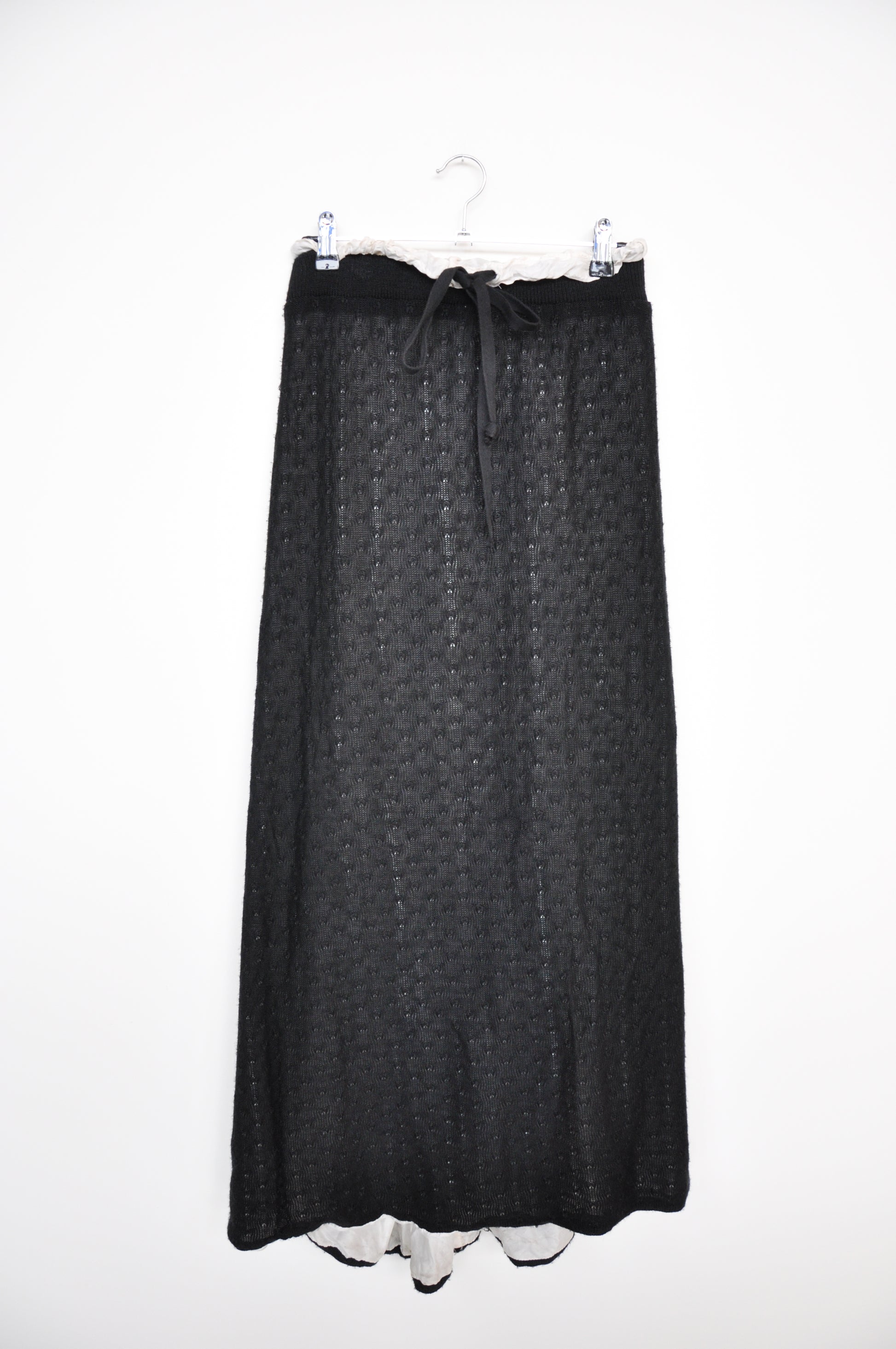 A long knitted skirt with silk lining. Two separate parts but attached at the bottom, you can wear the tops of the skirts and different heights if desired. By NZ brand Nom D