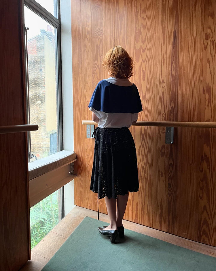 Odette Skirt in Black Lace, a flowing circle skirt crafted from delicate black lace. Designed with a keyhole tie opening, it can be worn high or low on the waist. Perfect for layering, this versatile piece adds an effortless, romantic touch to your everyday look.