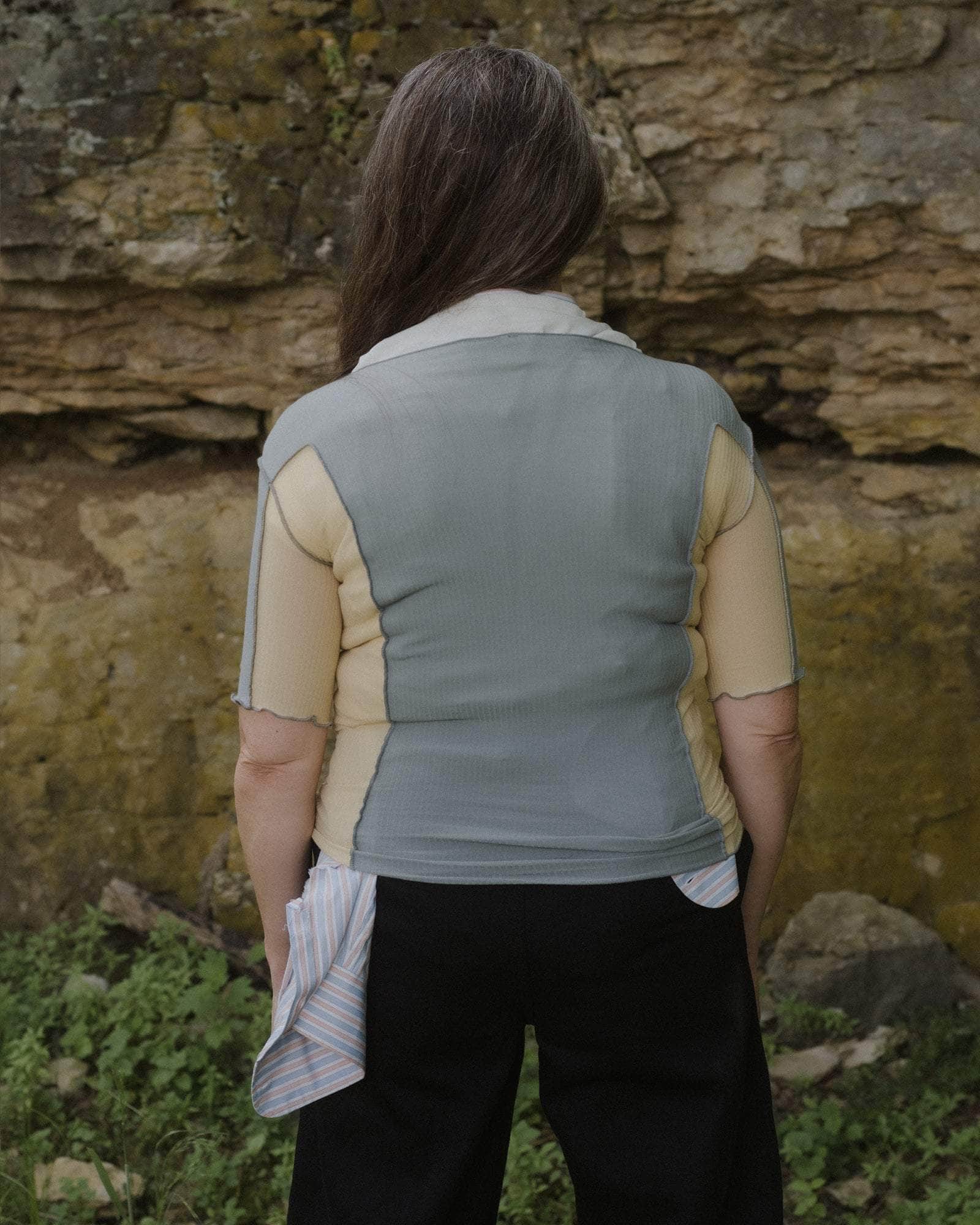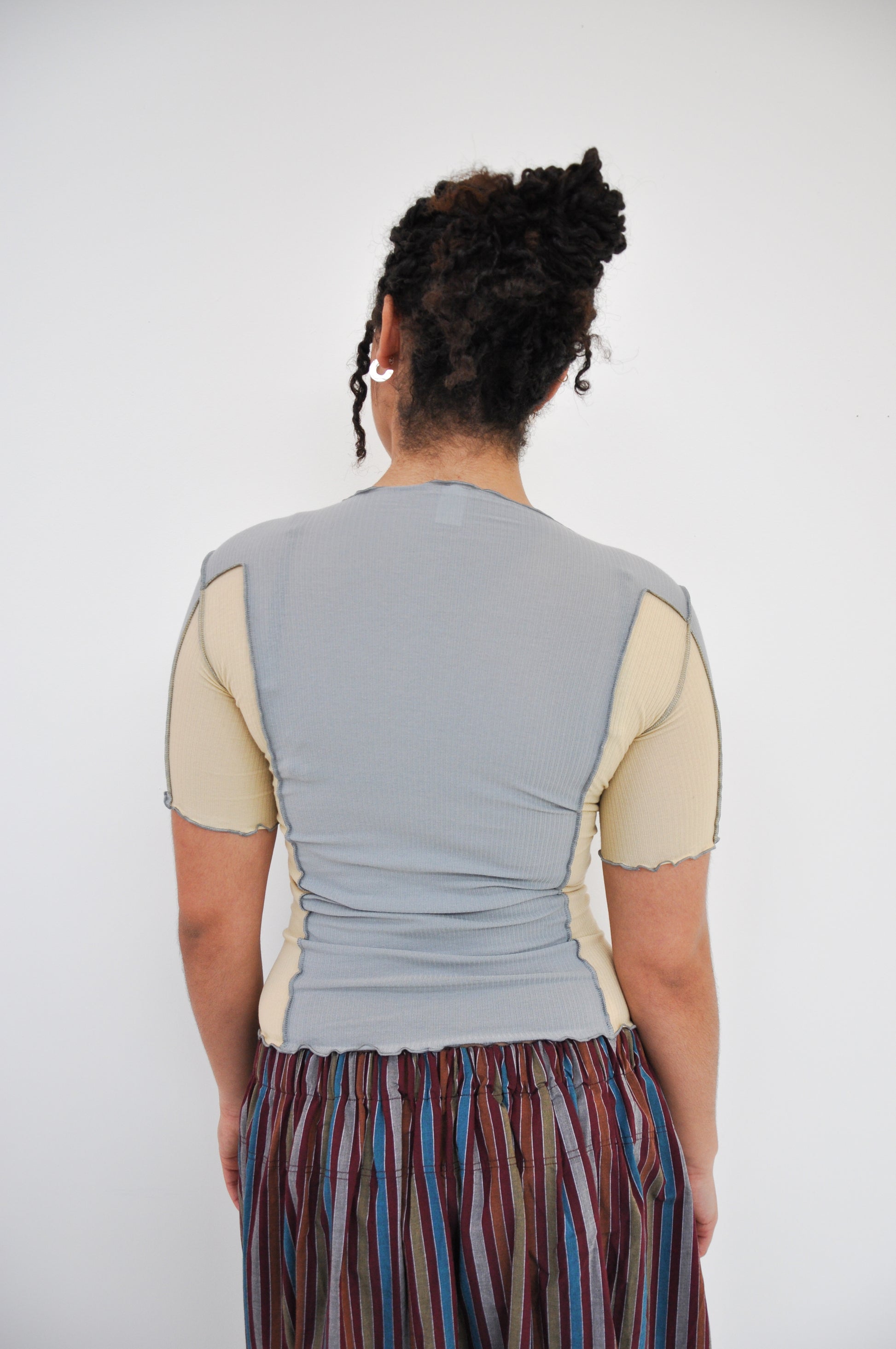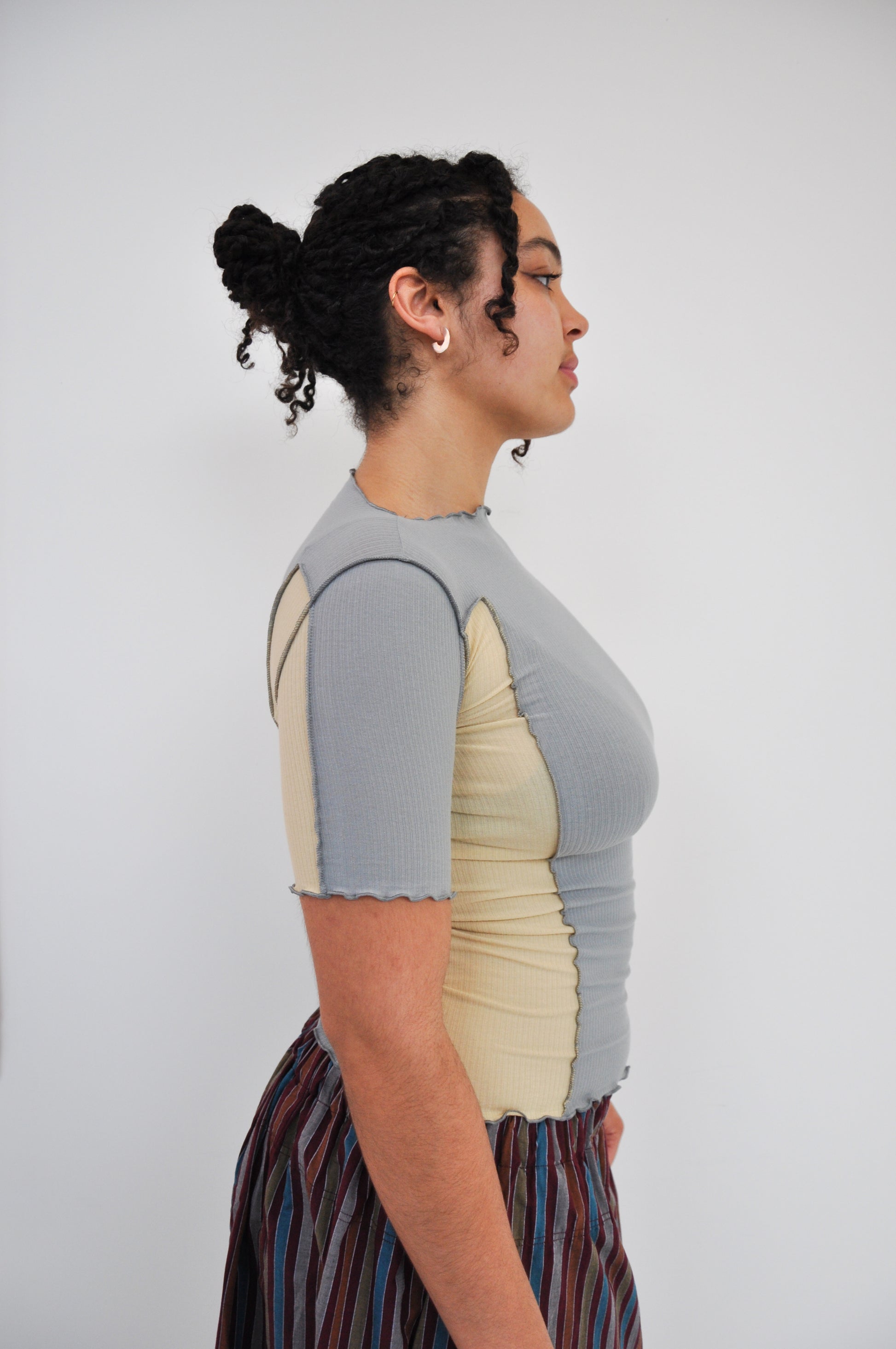 Omato 3/4 Tee in Bow Blue & Hen Yellow is a Organic cotton rib ¾ length sleeve tee. Boatneck. Exposed seams. Lettuce edge at neckline and hems. Runs small, consider sizing up.