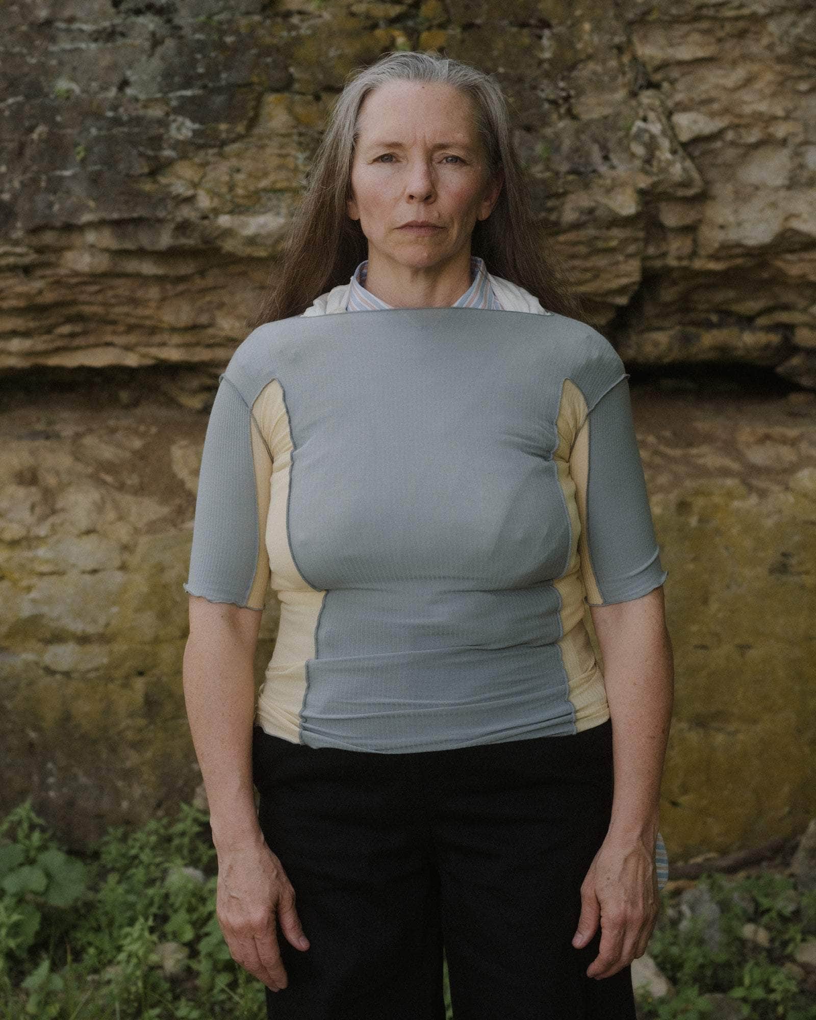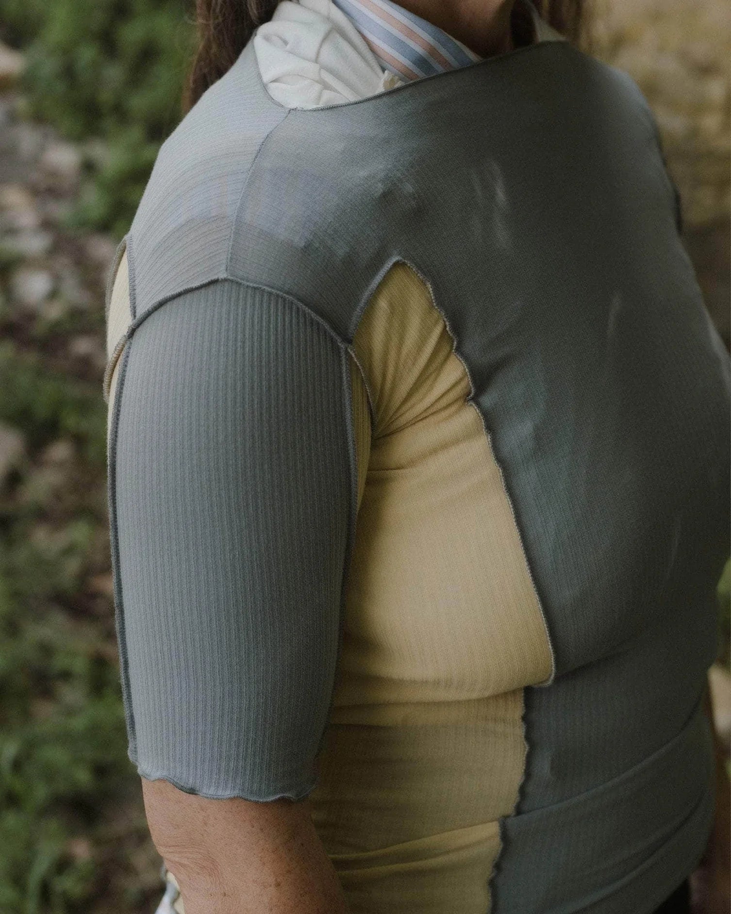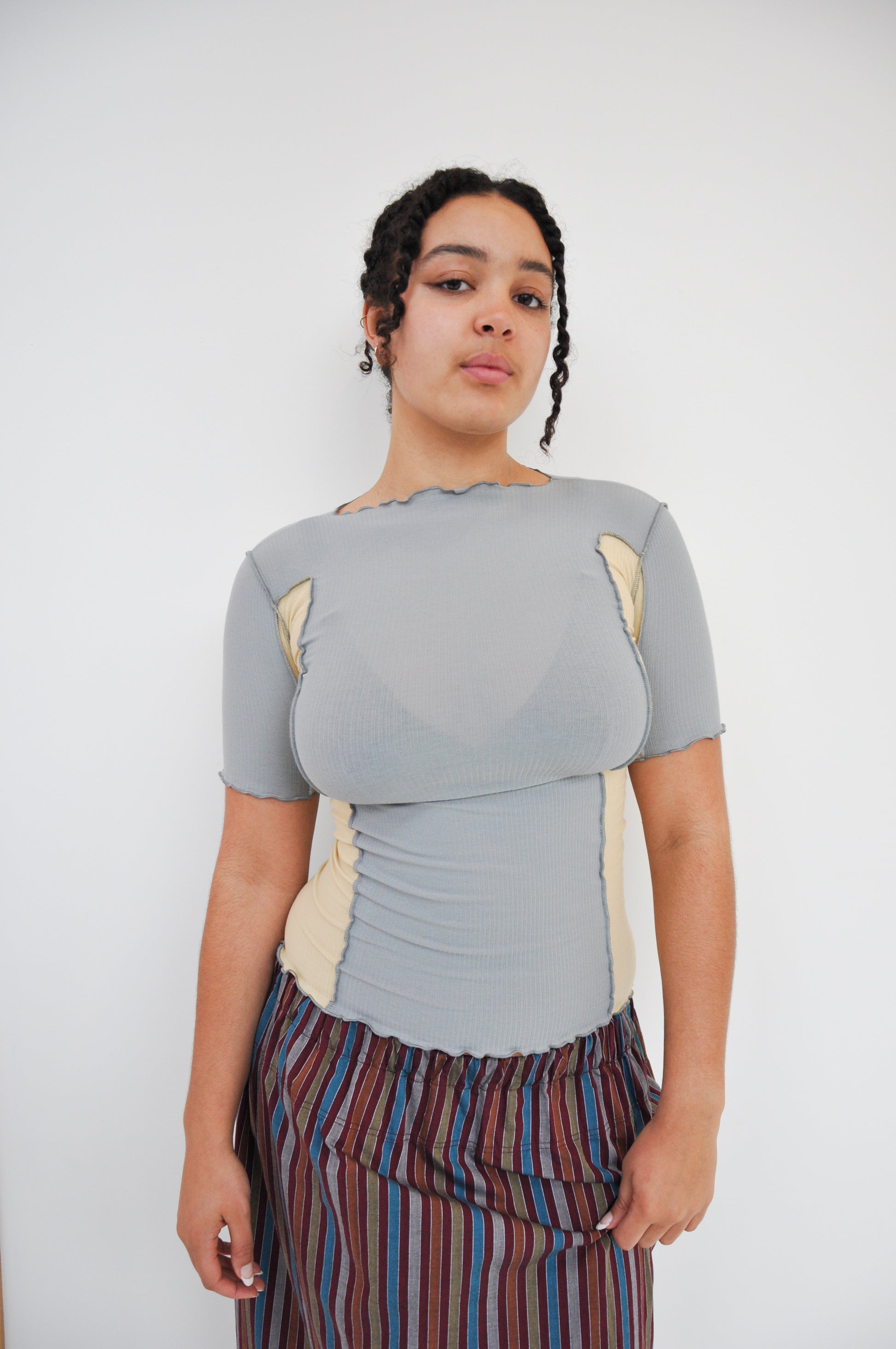 Omato 3/4 Tee in Bow Blue & Hen Yellow is a Organic cotton rib ¾ length sleeve tee. Boatneck. Exposed seams. Lettuce edge at neckline and hems. Runs small, consider sizing up.