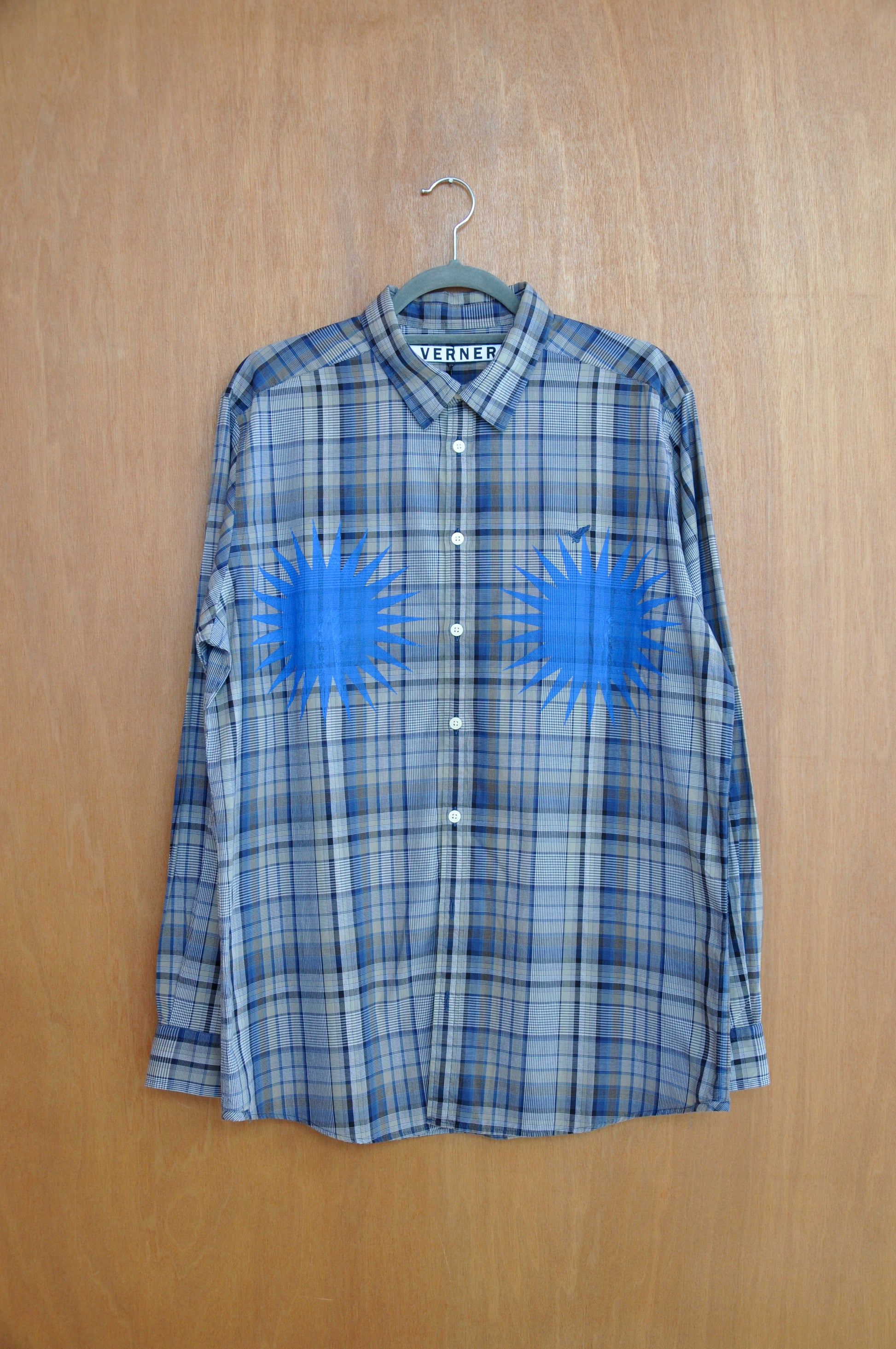 Overprint Star Shirt Upcycled #2 - VERNER UPCYCLED A collection of one of a kind pieces. Each garment has been hand-picked, repaired, reworked, dyed or printed. The Overprint Star Shirt is a button-up with an oversized fit, designed as a unisex piece for easy layering and everyday wear.