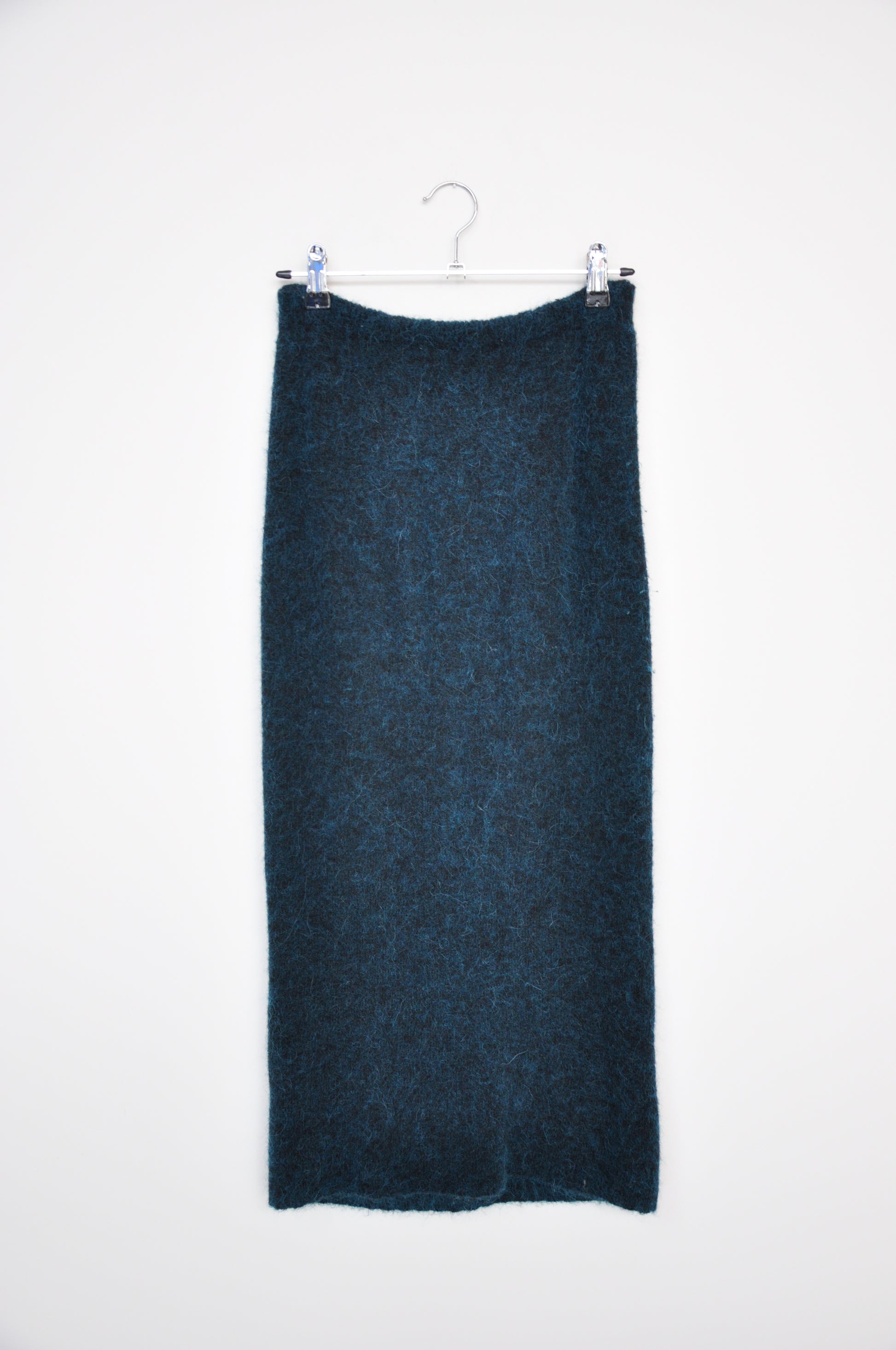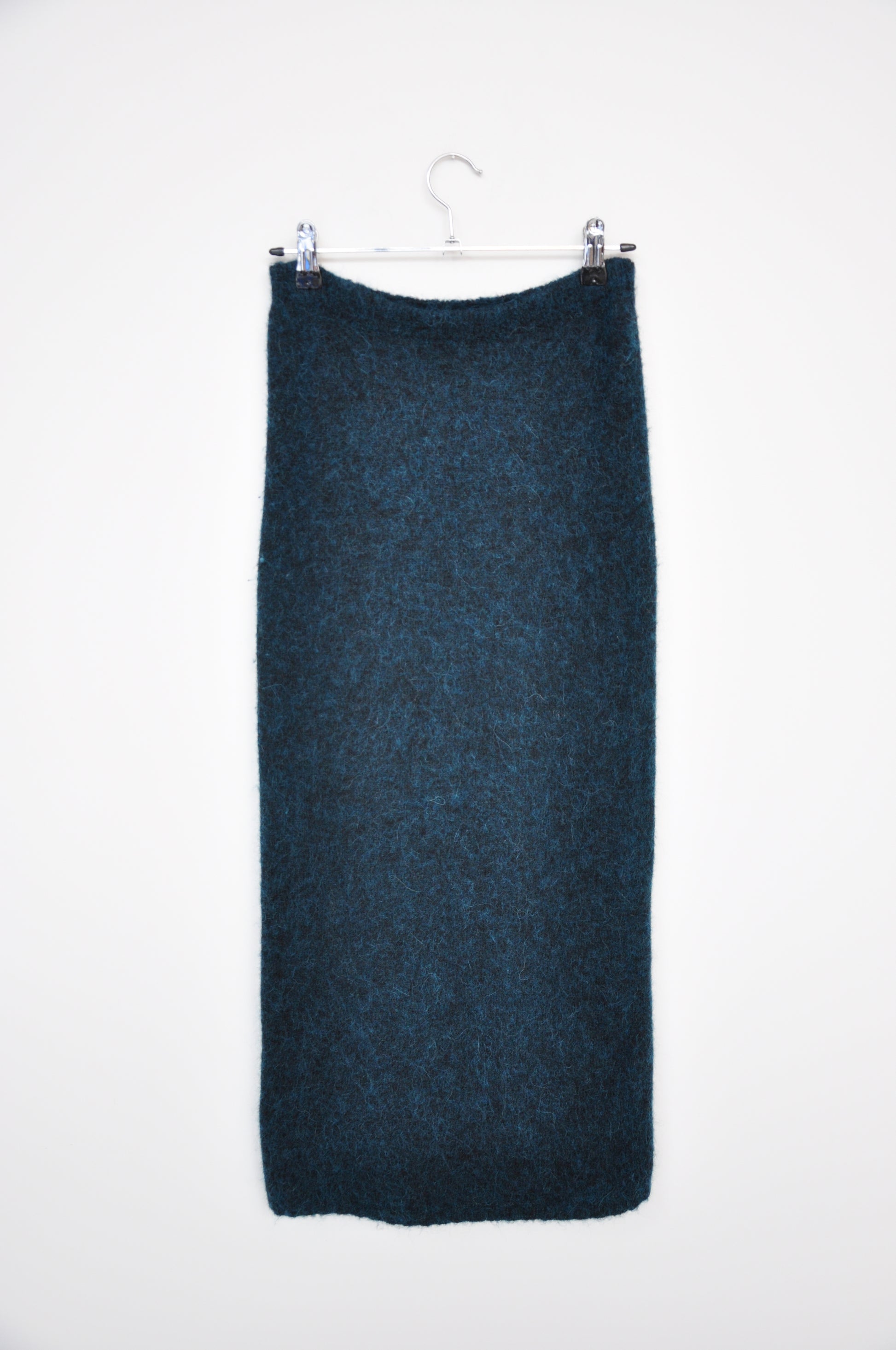 Mid/full length skirt with a textured, fuzzy appearance. It has a deep rich teal colour. Straight cut. By the brand Paloma Wool.