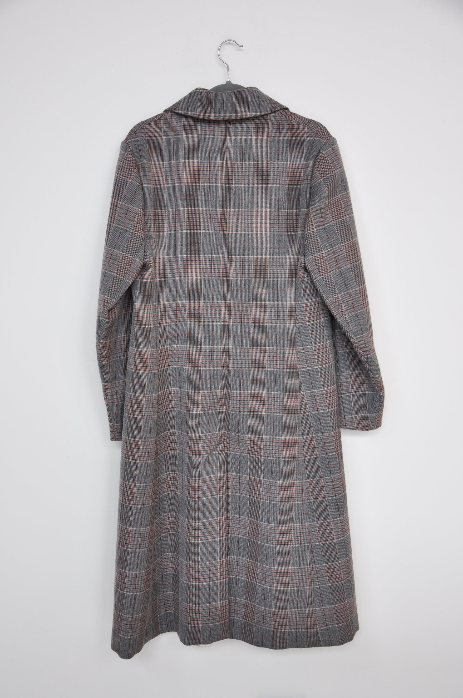 Full length wool coat, with brown silky lining. This coat has a strong shoulder with a notch lapel and button closures at the front. Includes a single vent at the back and two front pockets. By the brand Penny Sage in a 12.