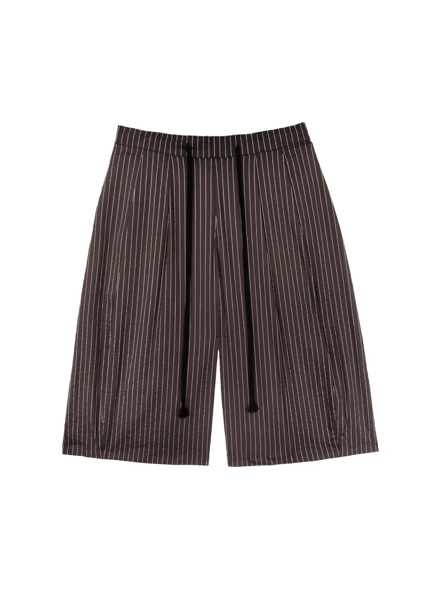 Pinstripe Pleat Shorts in Brown & White, a knee-length, wide-leg shorts with a pleated waist, centre-back zip, and in-seam pockets. Features a drawstring waist for added comfort. Materials: Pinstripe Lightweight Cotton Suiting Size & Fit: Relaxed fit. Take your usual size for a comfortable, easy silhouette.