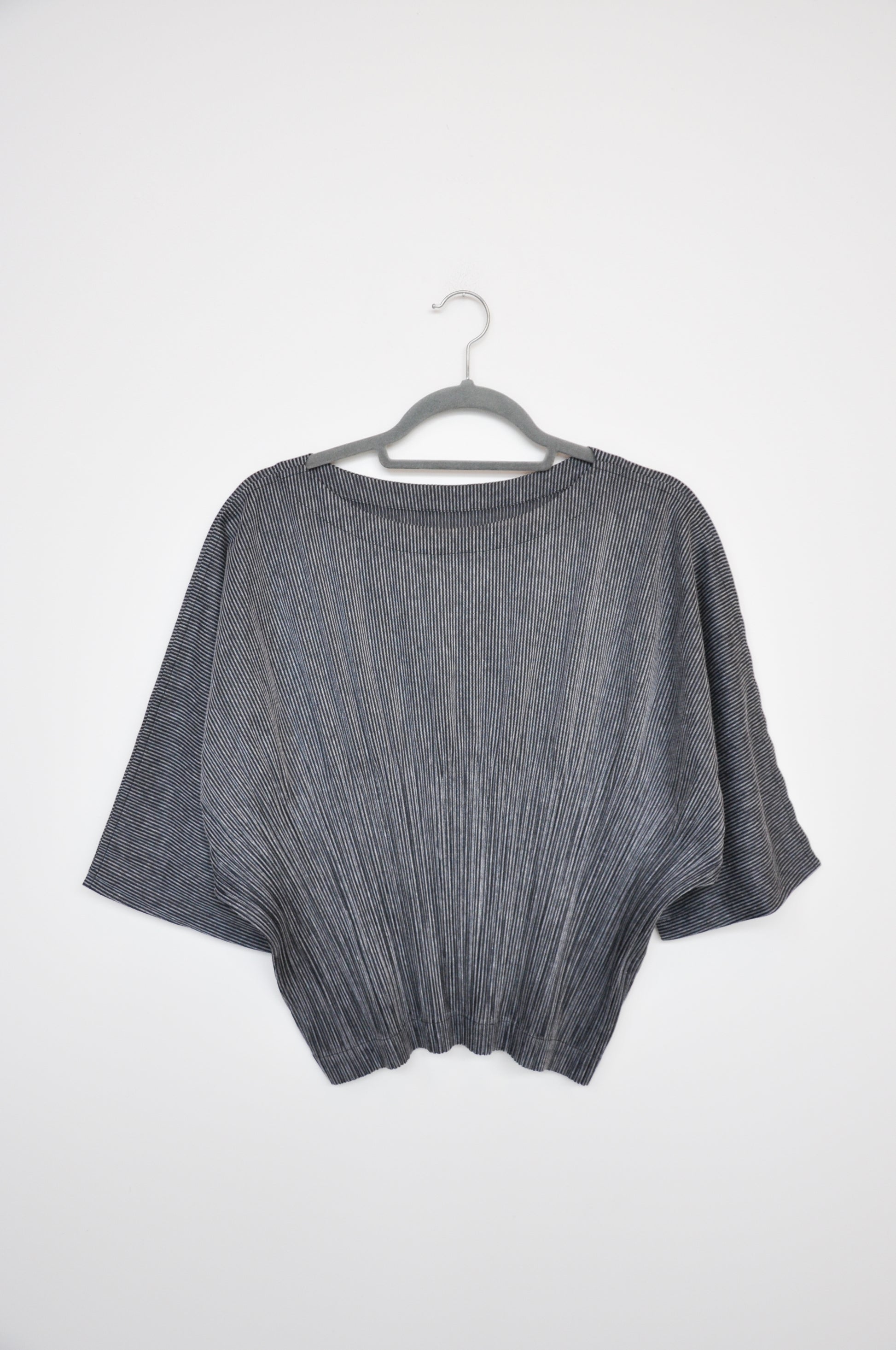 Wide cut top. Scoop neckline. Pleated halfway down the top. Short sleeves. Striped in black and white. By the brand Issey Miyake.