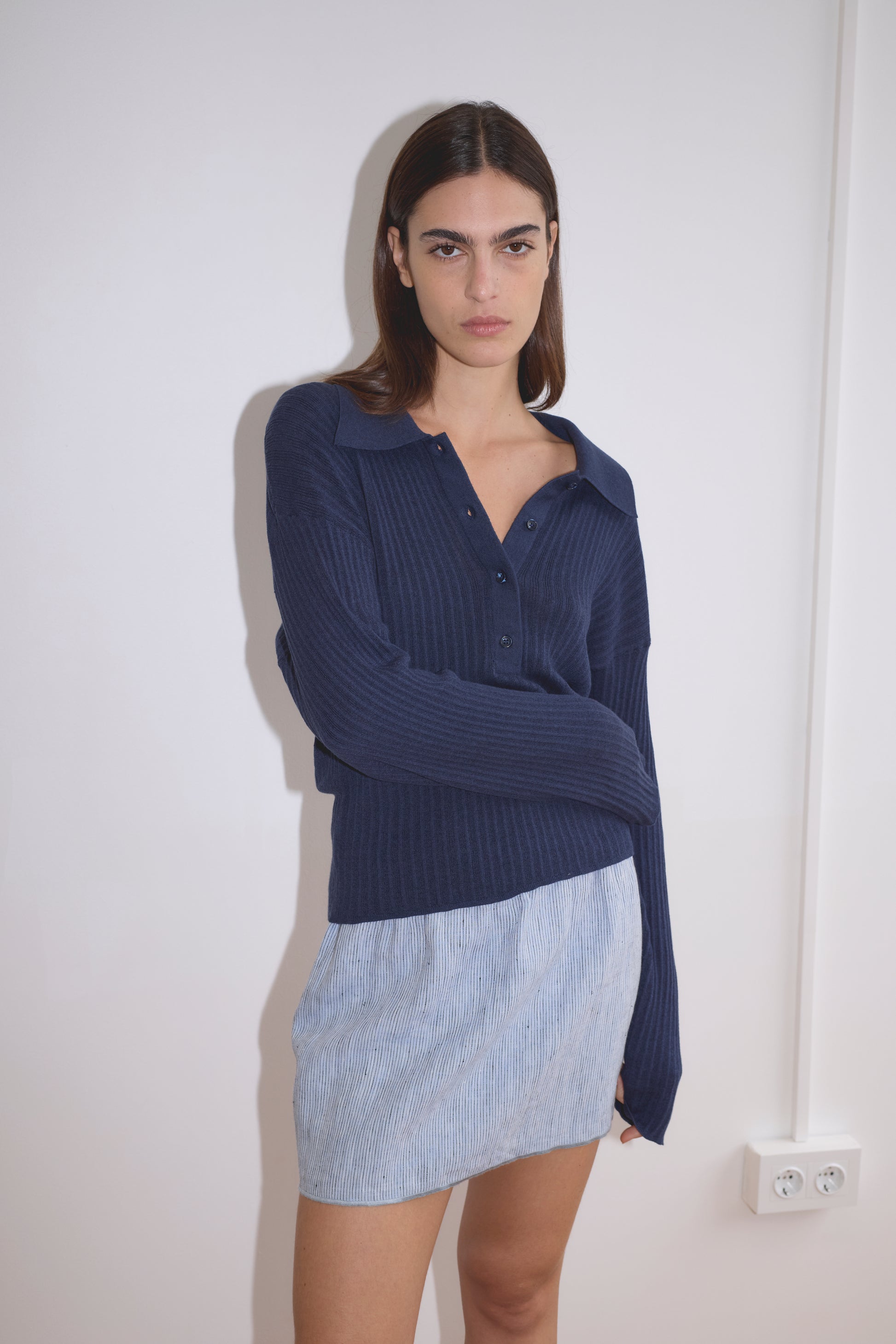 Polo Knit in Dark Blue is a a relaxed polo knit long sleeve top featuring a soft open collar with button placket and dropped shoulders made from 100% organic cotton