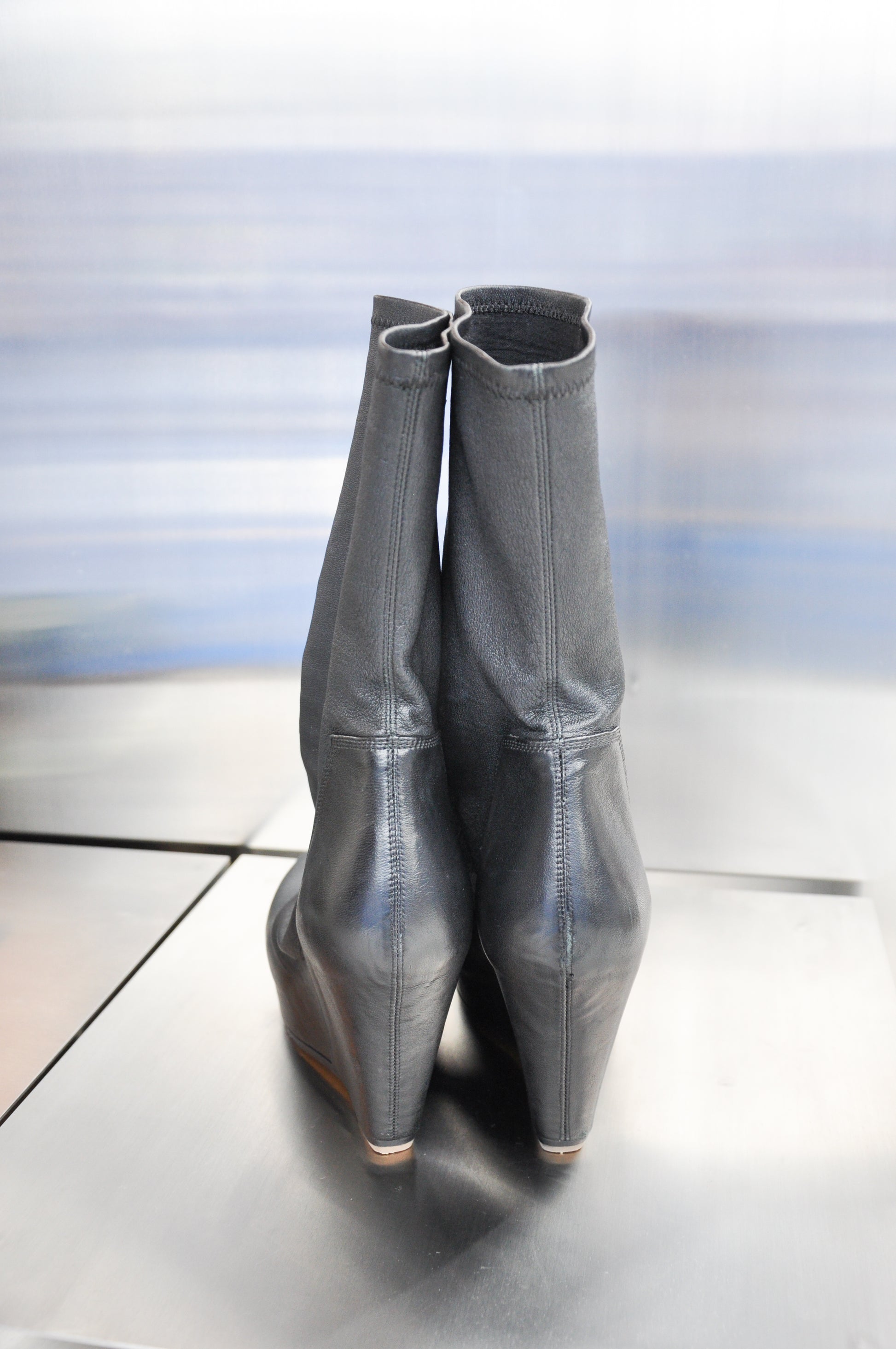 Wedge heel boot, made of a very soft and supple leather with a nice shine to it. Featuring sock like panels wrapping up calves. By the brand Rick Owen's.