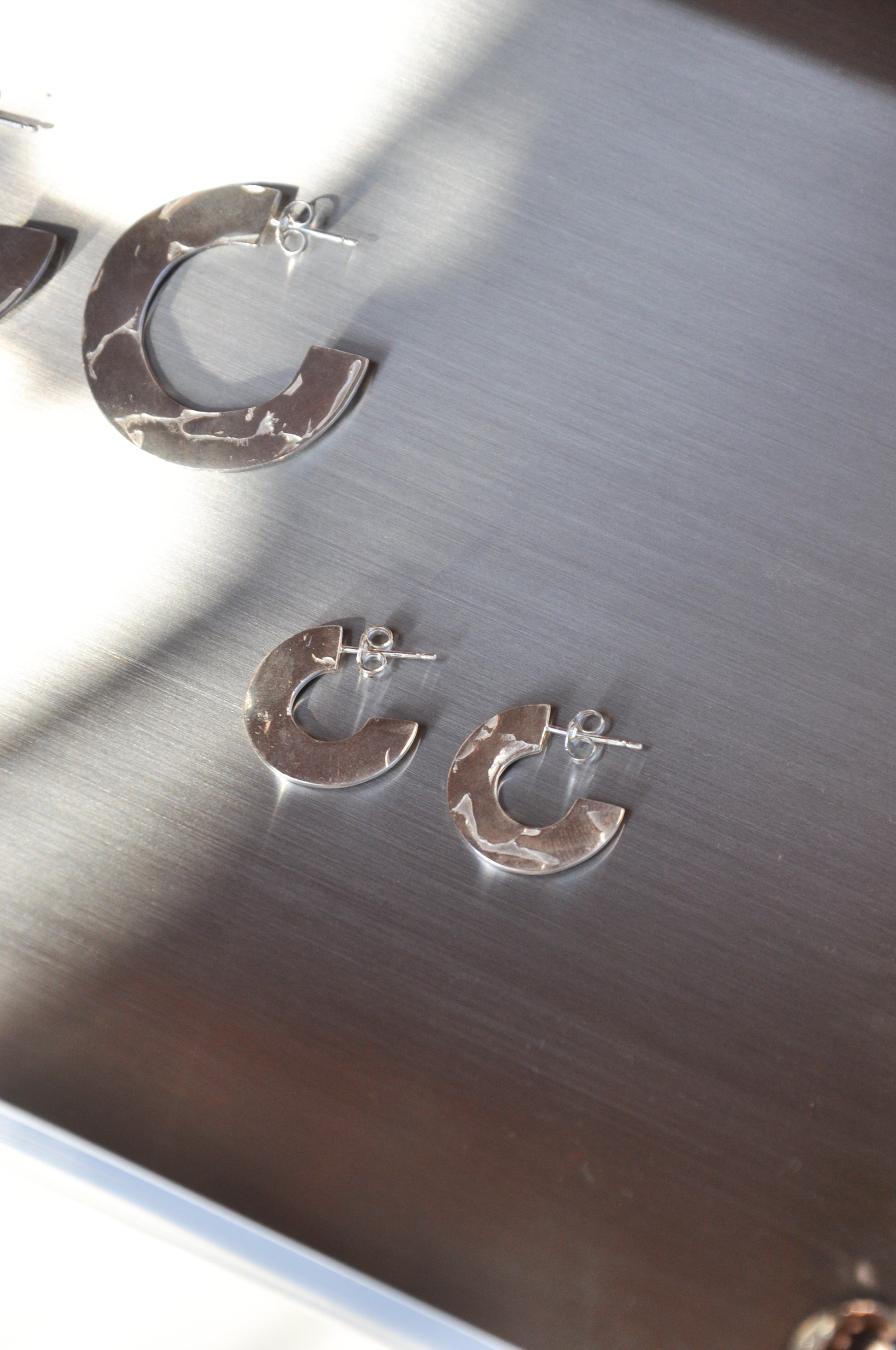 River Hoops in Silver – The perfect shaped hoop with an organic, imperfect texture. Hand-formed in wax and cast in sterling silver by Grace, these timeless earrings blend elegance with a raw, natural finish.