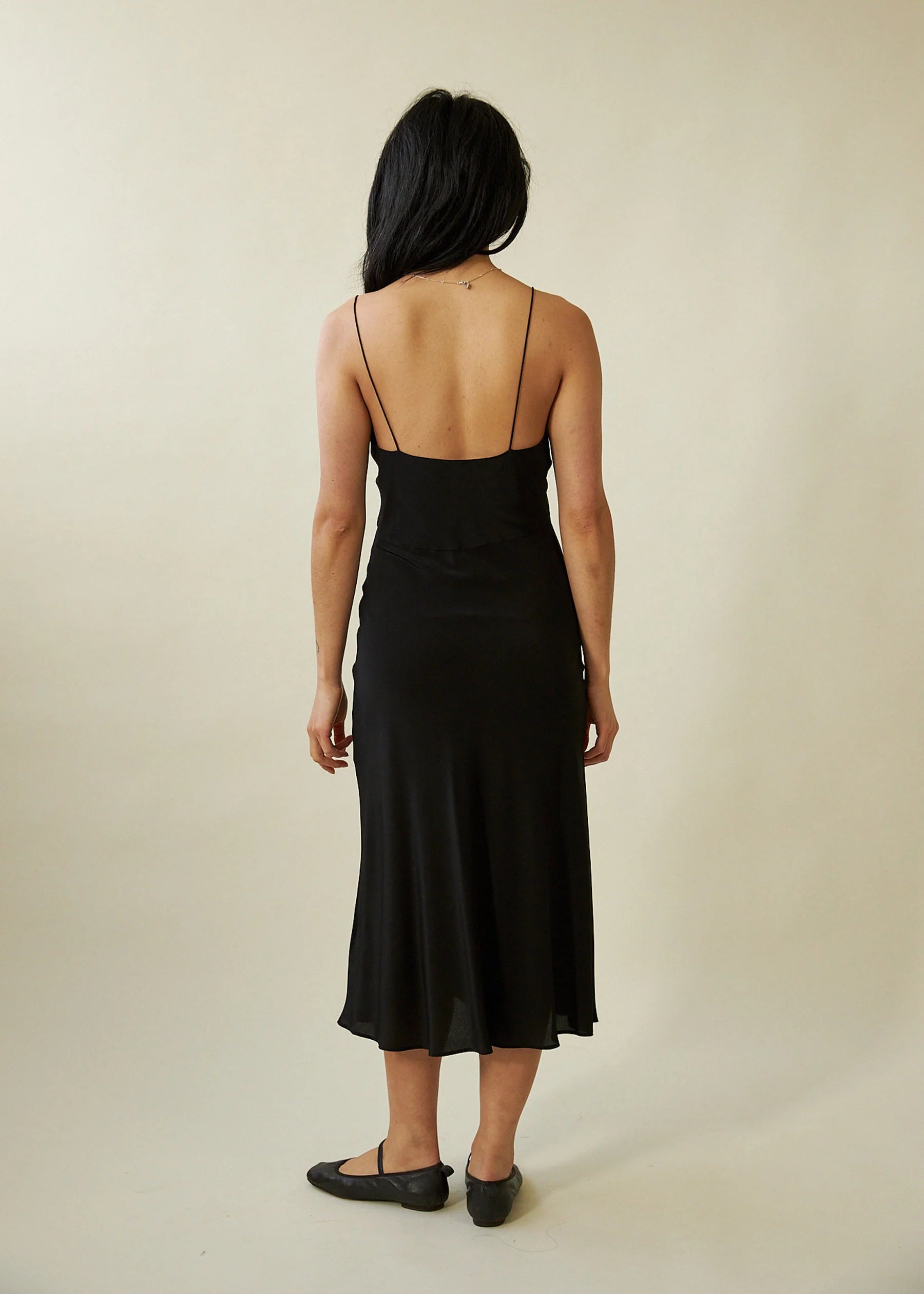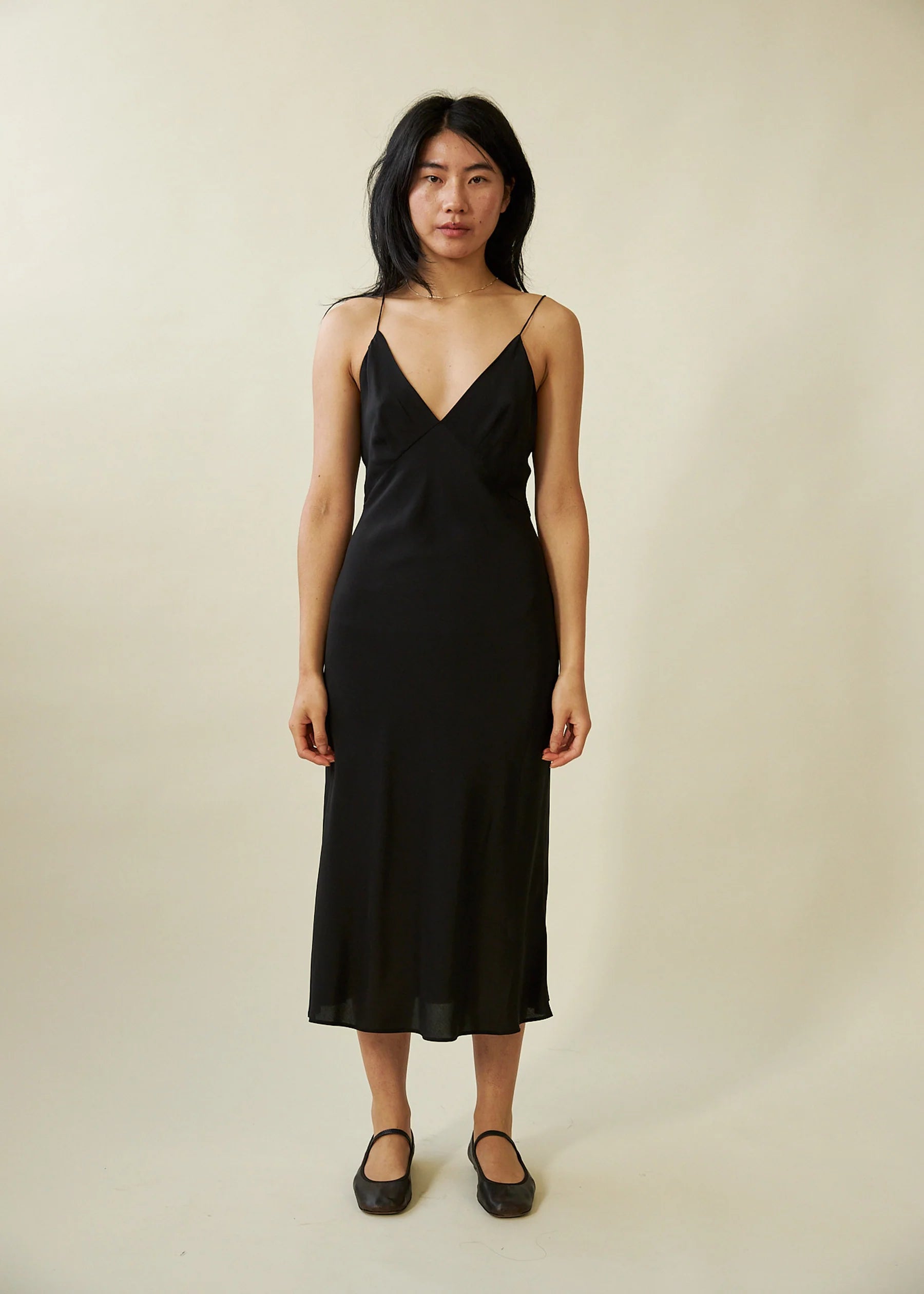 Roberta Dress in Black a bias-cut midi slip dress in luxurious silk crepe de chine. Features thin rouleau straps and a deep V-neckline. Darted bust panels are fully lined. Finished with French seams.