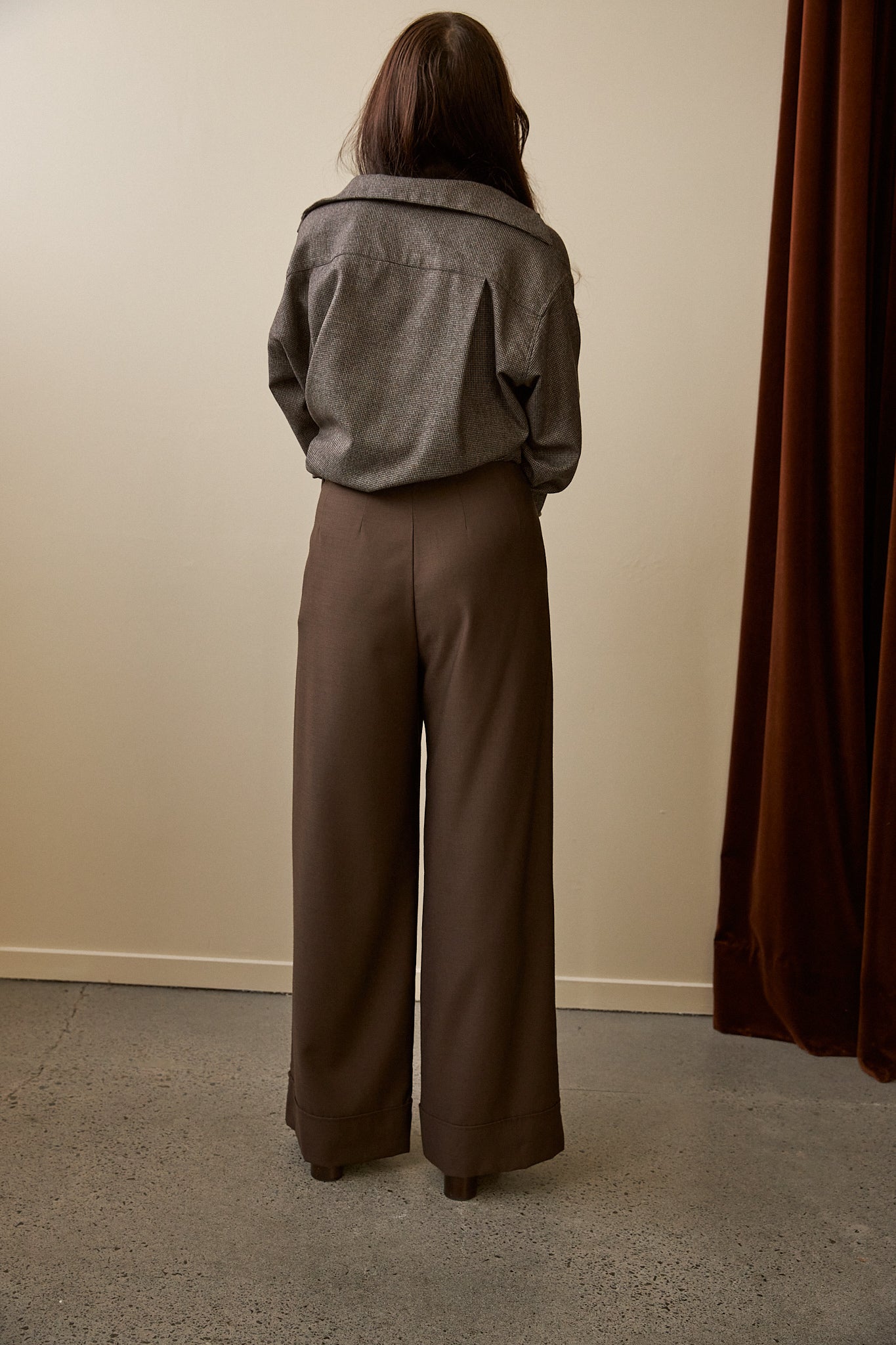 Saudade Trouser in Chocolate is a high waisted wide leg trouser in a soft wool suiting. Features pointed patch pockets at the front, wide turned up hems, and front and back darts for shaping. Fastens at the side with an invisible zip