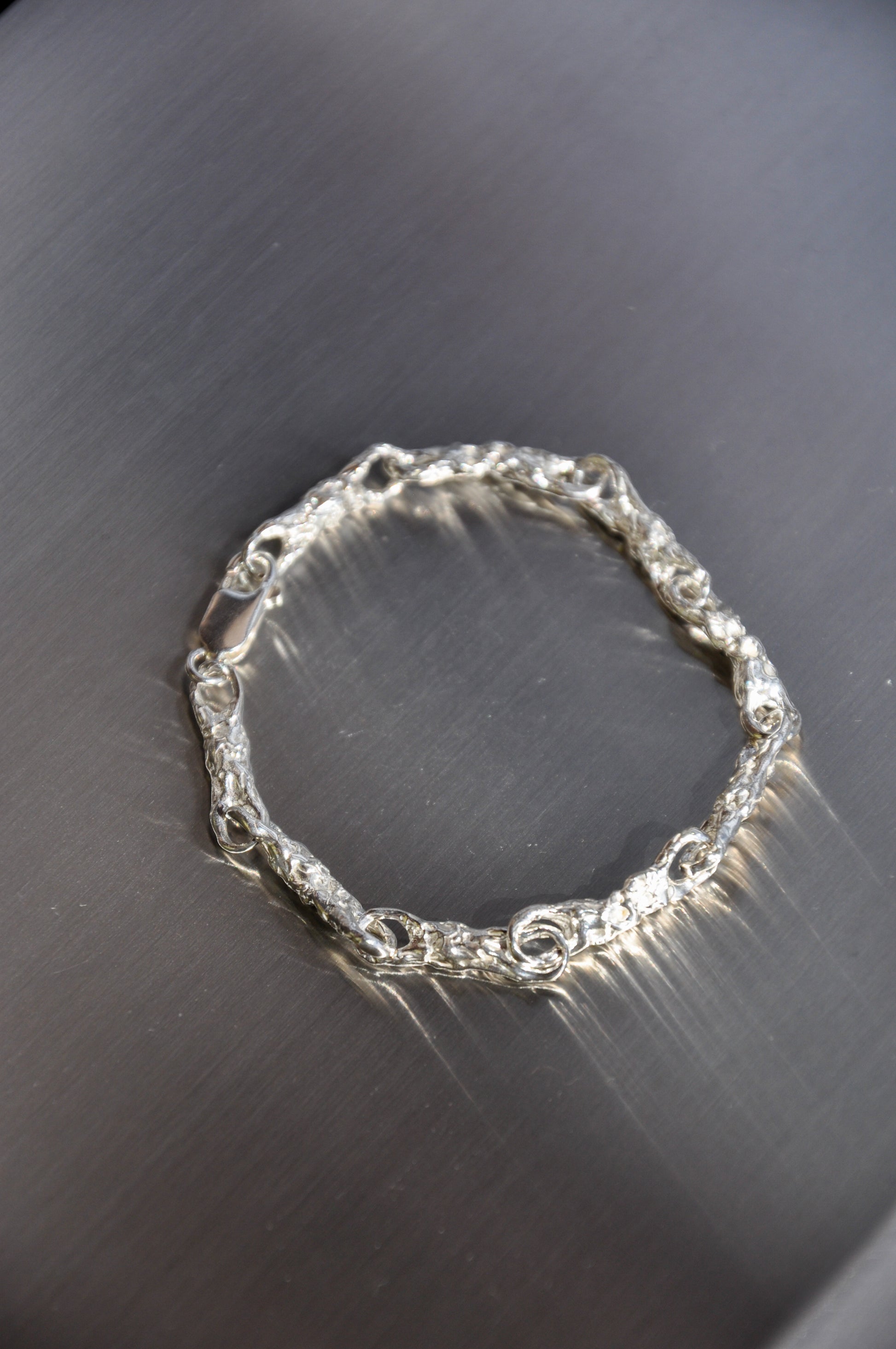 Sculpted Chain Bracelet in Silver, is a series of links all hand crafted and cast in sterling silver. Sculptured in wax, cast, hallmarked and finished by hand in Tāmaki Makaurau.