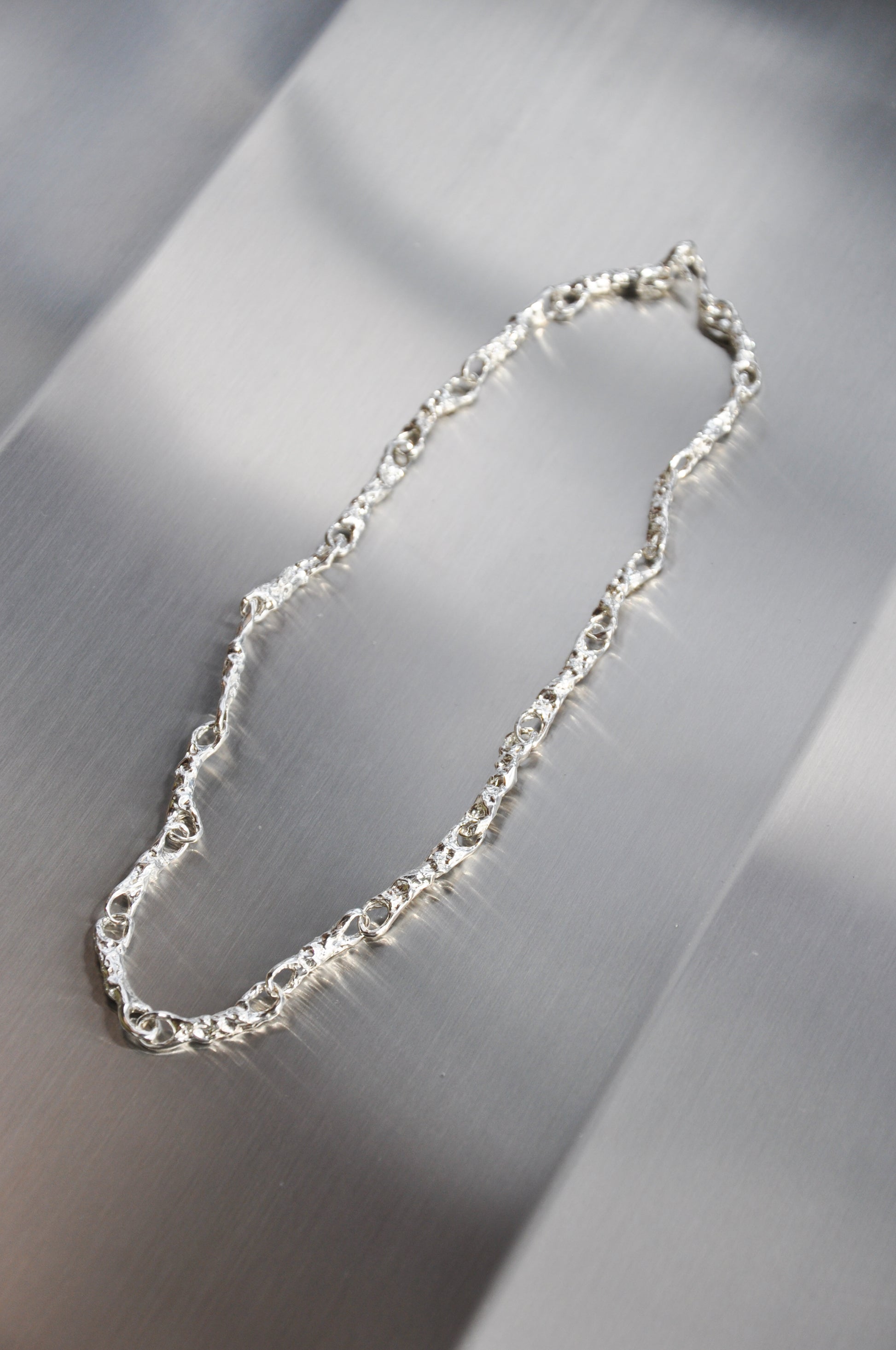 Sculpted Chain Necklace in Silver, is a series of links all hand crafted and cast in sterling silver. Sculptured in wax, cast, hallmarked and finished by hand in Tāmaki Makaurau.