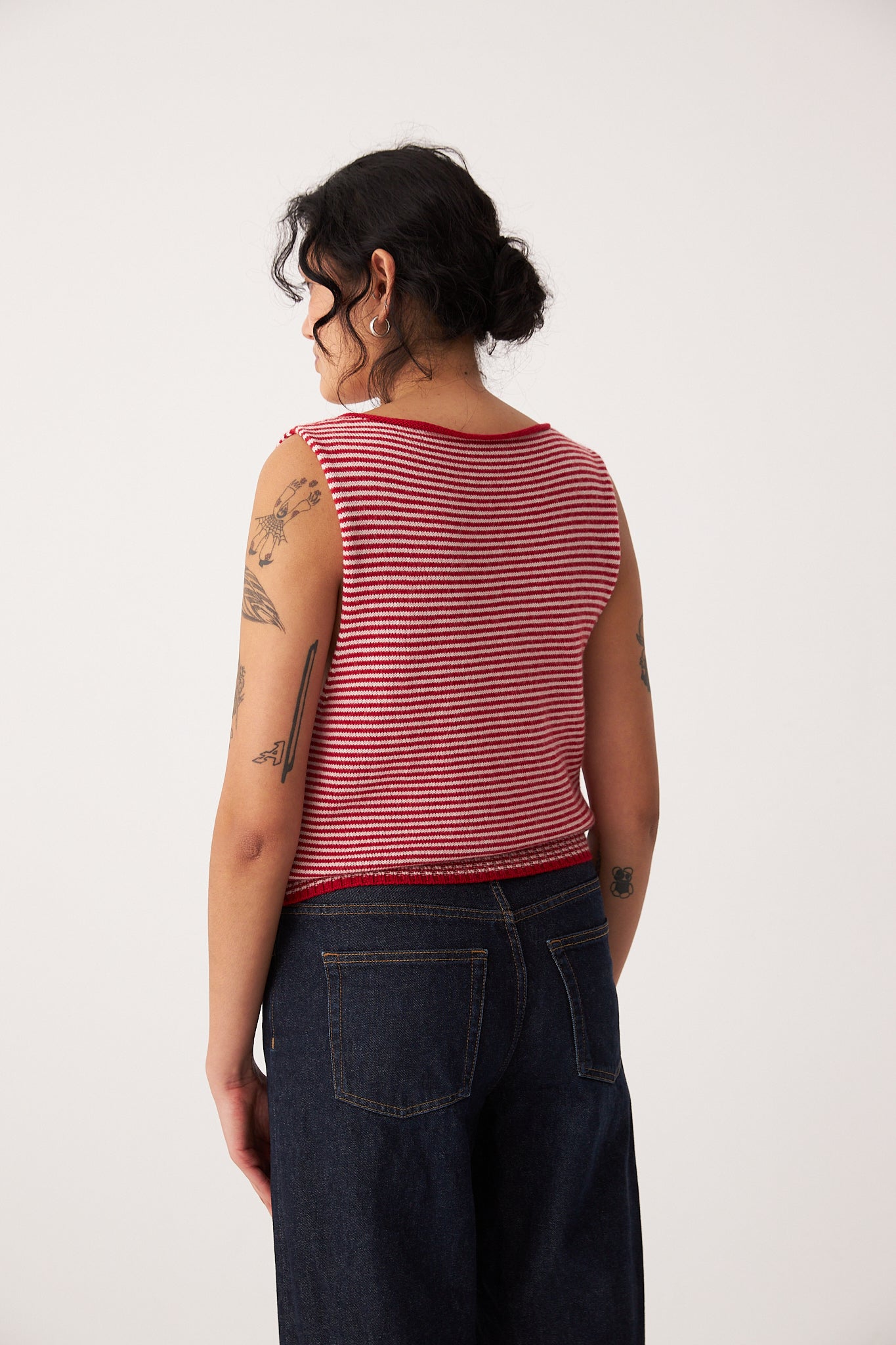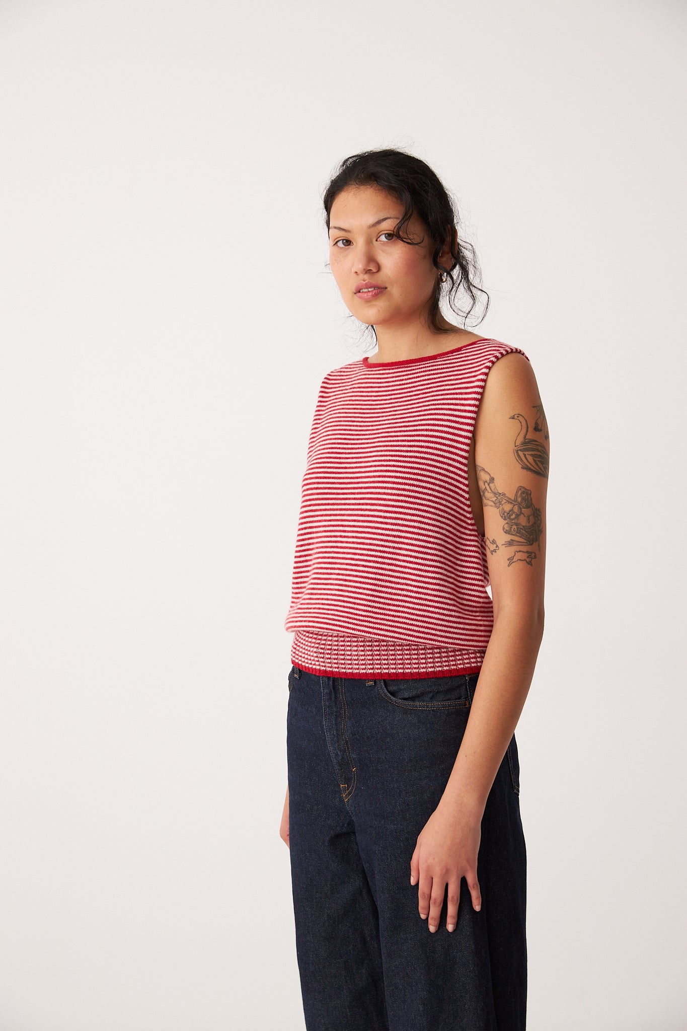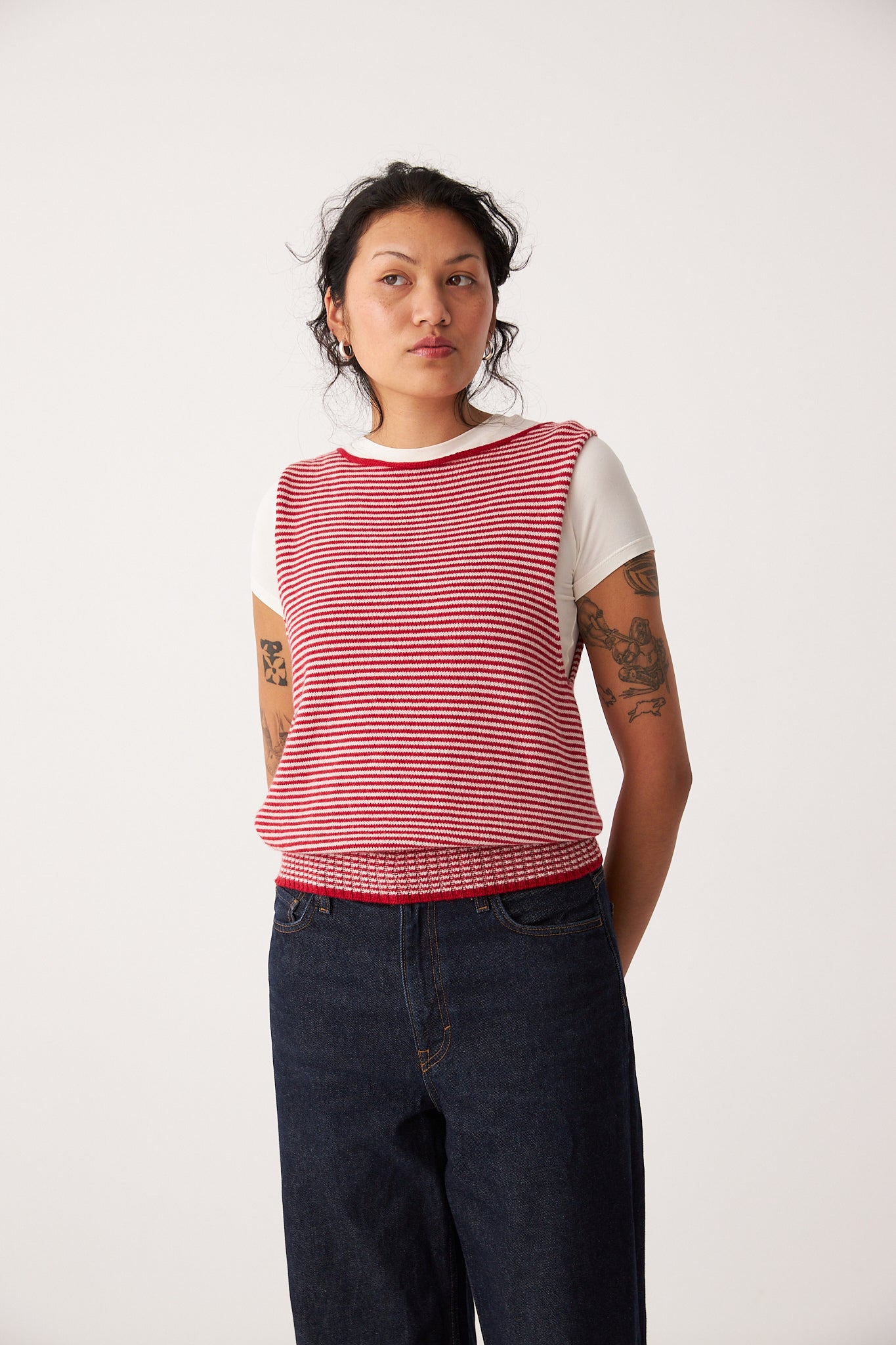 Striped Star Vest in Cherry, Creme Stripe - the beloved roll-neck vest is reimagined in trans-seasonal merino stripe. The special qualities of wool mean that it is cool enough to be worn in summer as a top and warm enough to be layered in winter as a vest. A slightly cropped style designed to finish at the waist, we recommend sizing up if you prefer hip length.