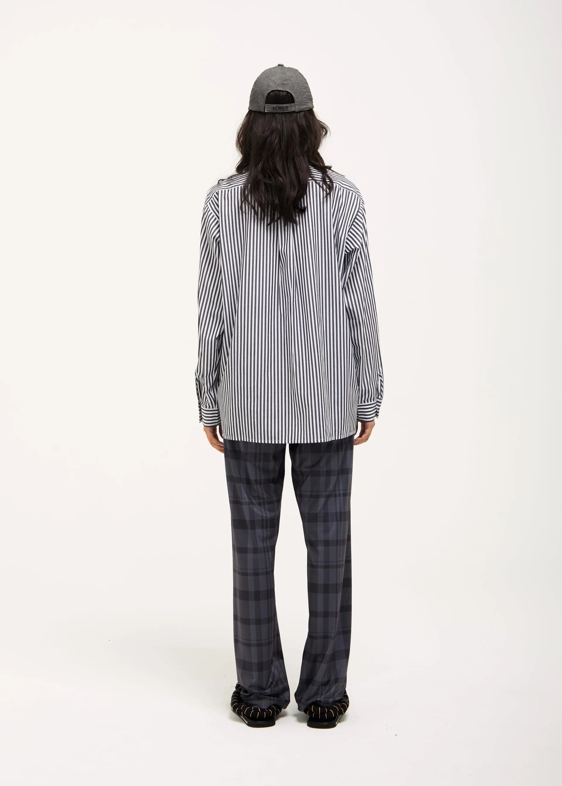 Sun Shirt with Tie in Black & Grey, a unisex oversized button-up shirt in striped cotton shirting with a contrast circle appliqué. Comes with a matching striped cotton shirting neck tie.