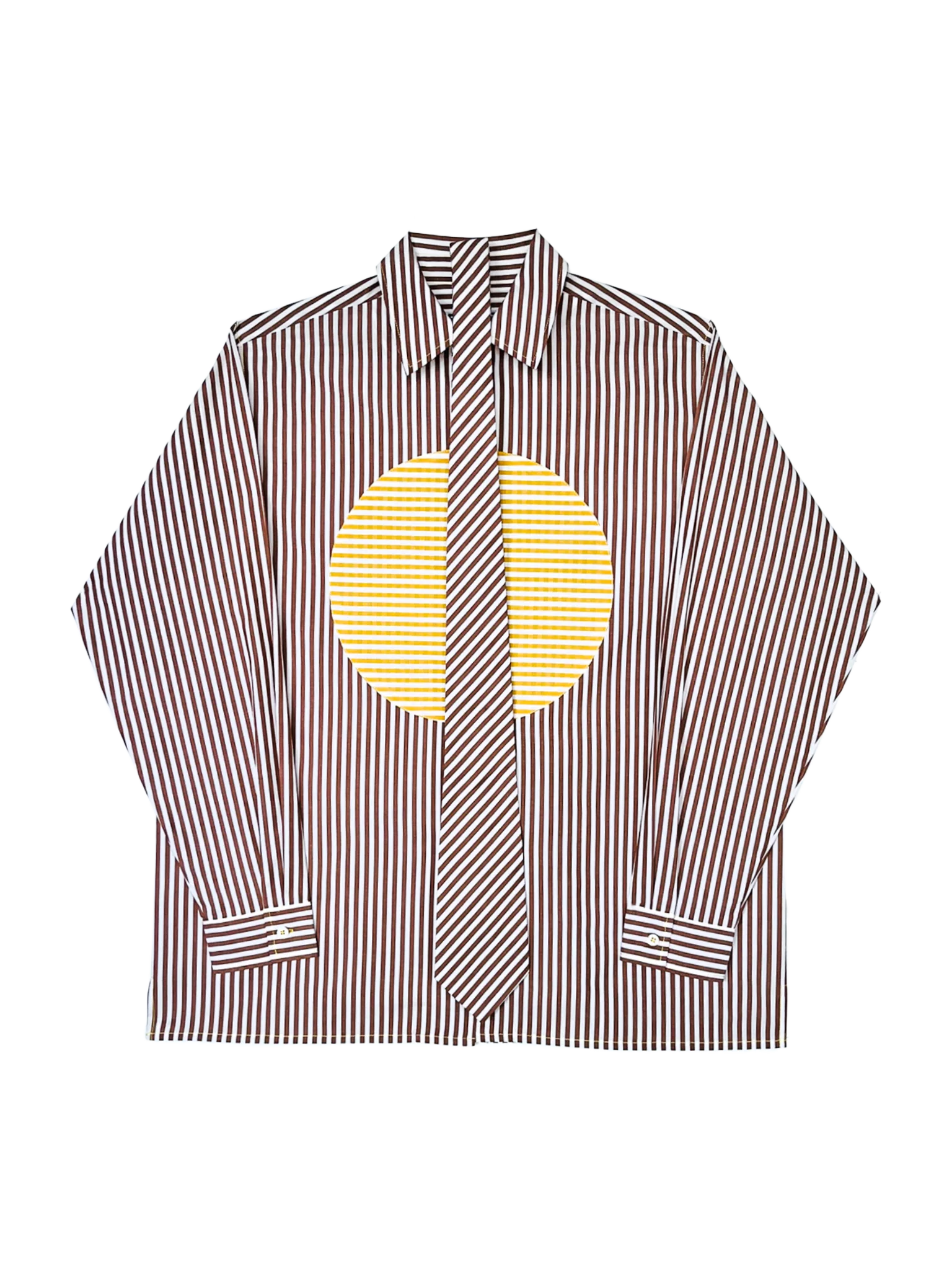 Sun Shirt with Tie in Yellow & Brown, a unisex oversized button-up shirt in striped cotton shirting with a contrast circle appliqué. Comes with a matching striped cotton shirting neck tie. Materials: Striped Cotton Shirting Size & Fit: Oversized fit. Take your usual size for a relaxed, roomy silhouette.