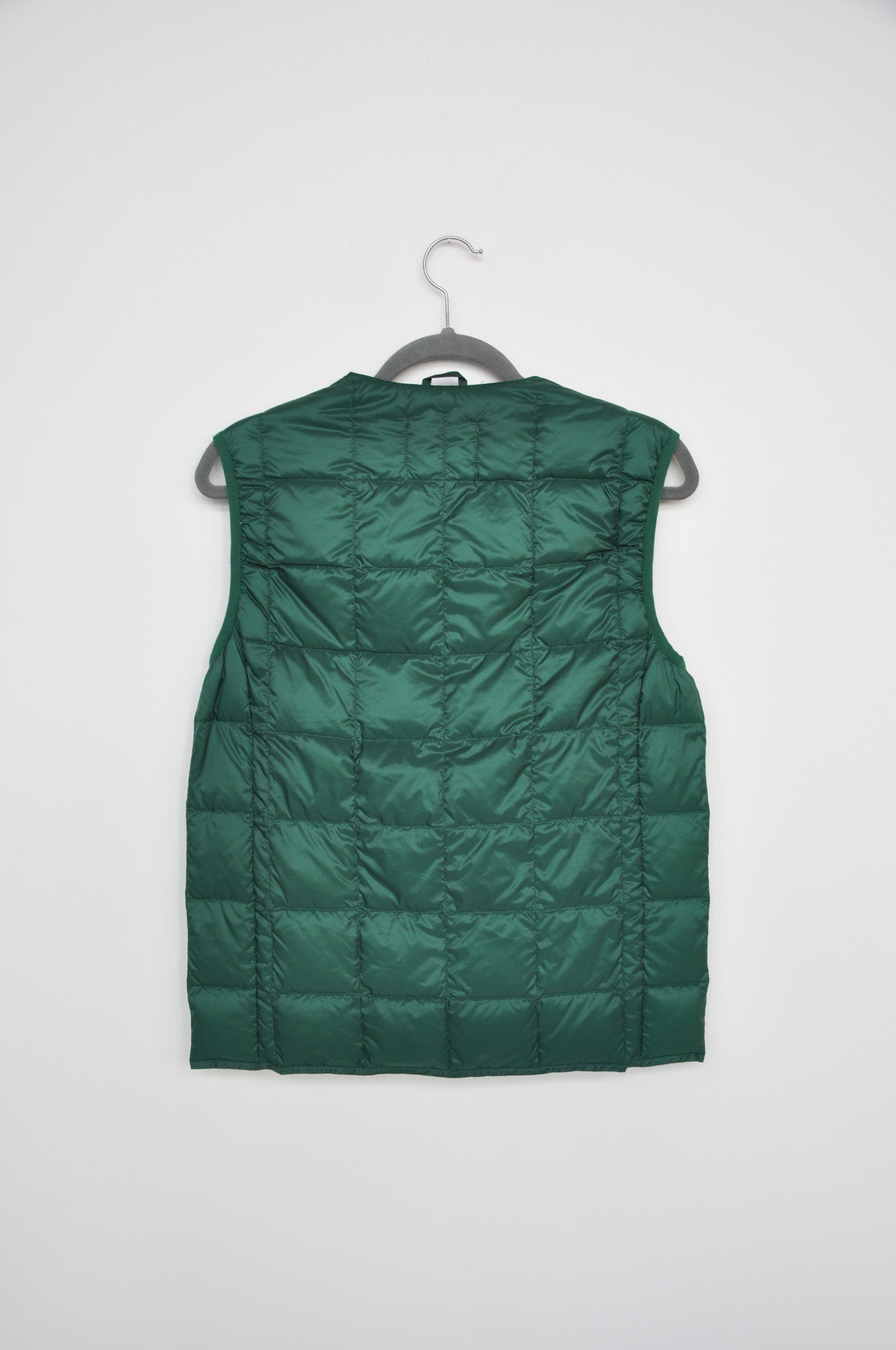 V-neck down vest. Snap button closure. Two zippered pockets. By the brand Taion.