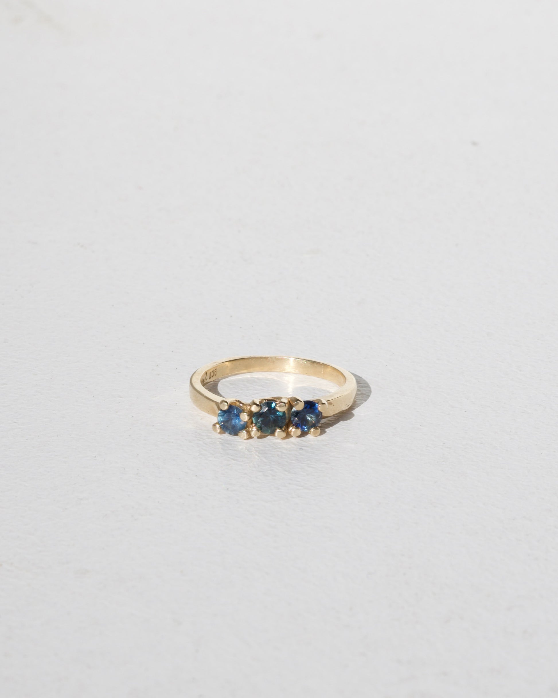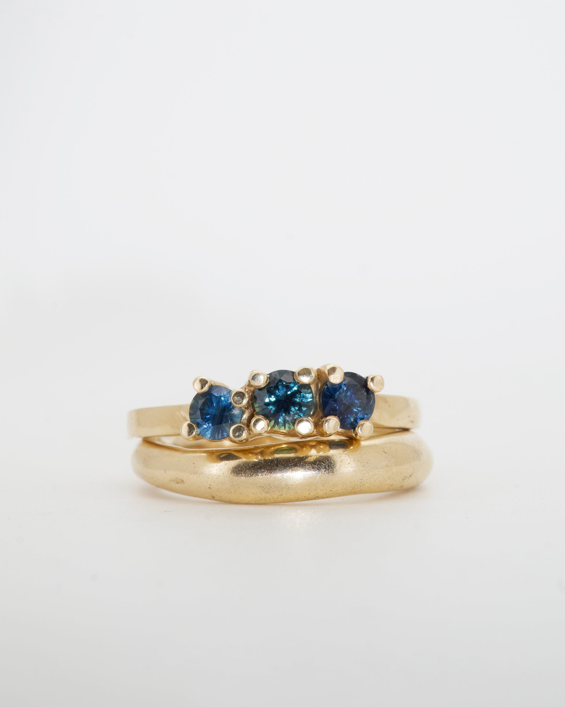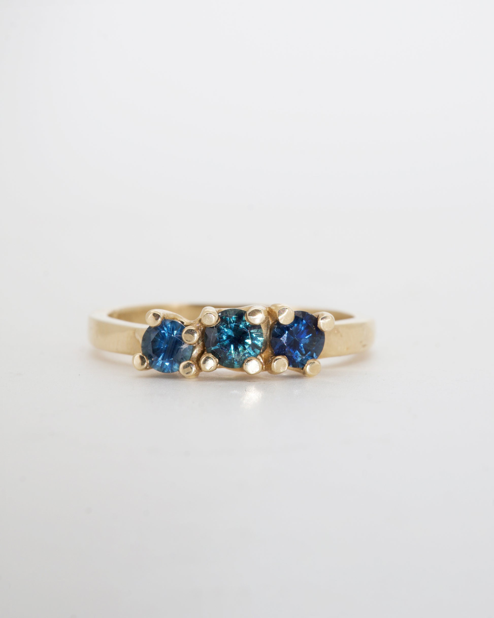 Teal Sapphires & 9ct Yellow Gold - A trio of varying teal sapphires set in solid 9ct yellow gold. A contemporary take on the classic bridge ring. This style features fluid side details and melted metal forms, each piece revealing its materiality. Formed in wax and cast in metal.