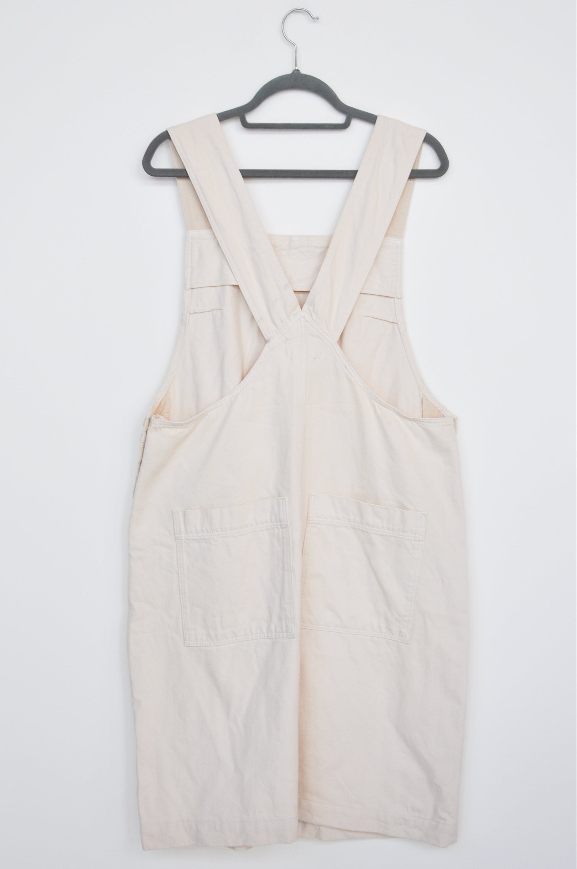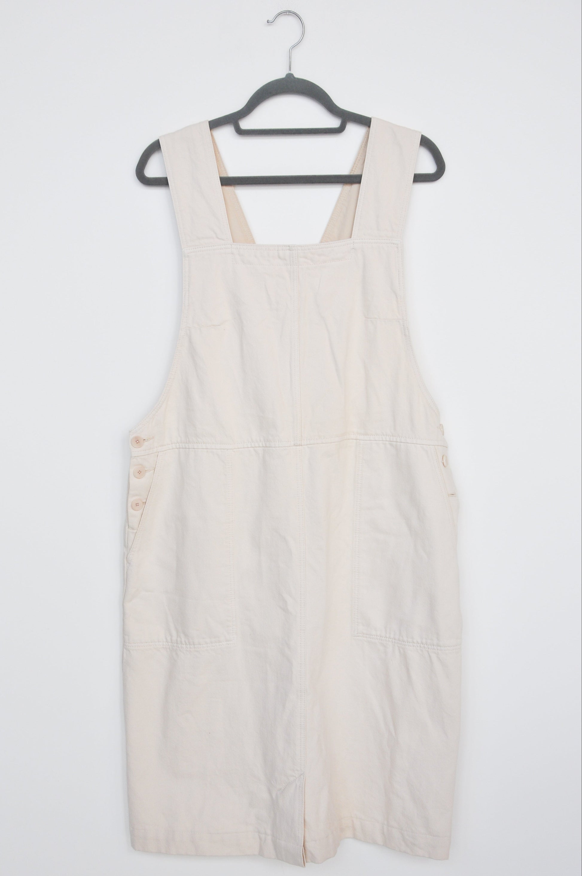 Pinafore dress is made from beige cotton with a square neckline. A-line shape with large patch pockets. Three button closure on the sides of the dress. By the brand Toast.