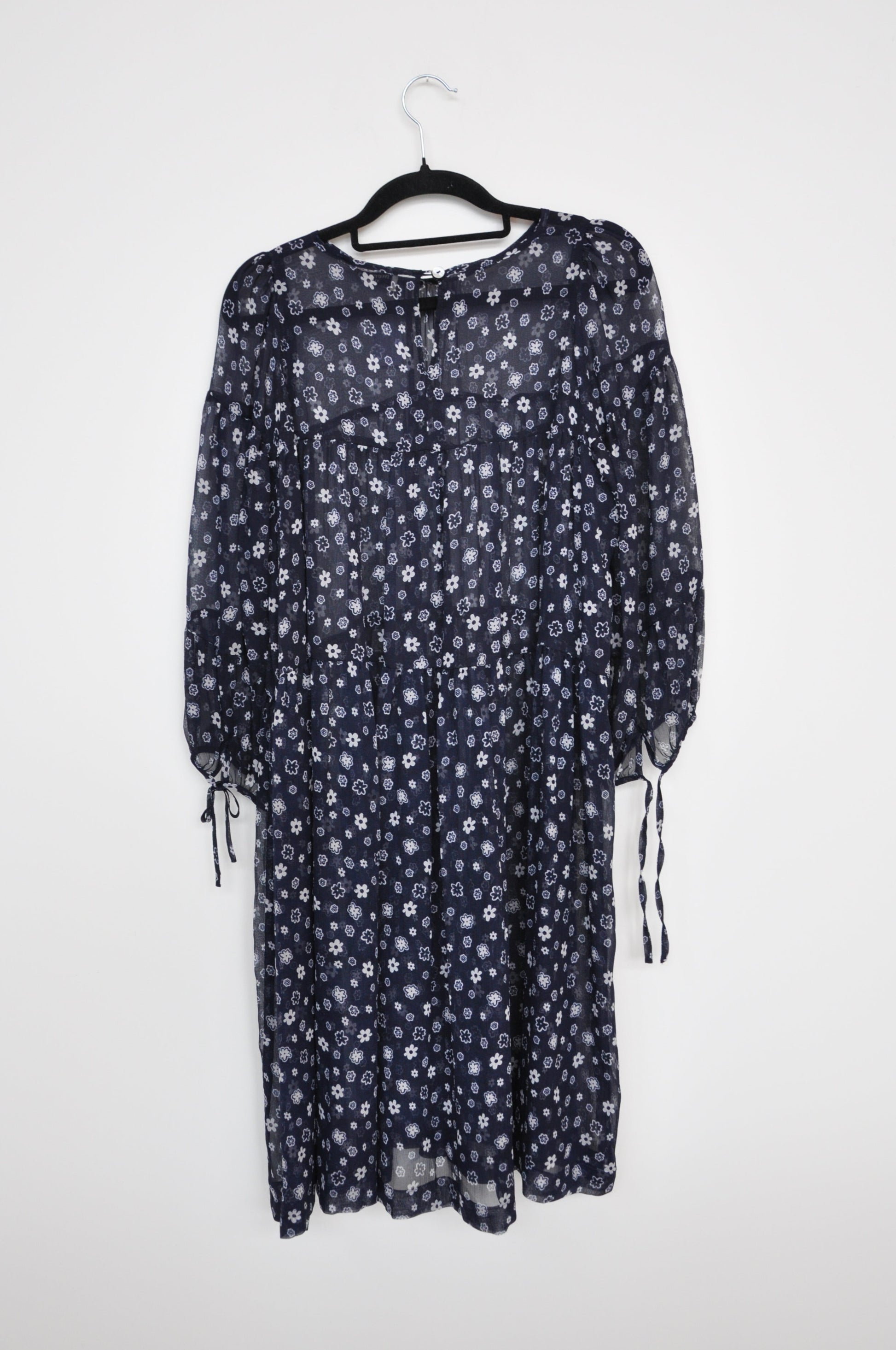 Floral pattern displayed all over. The dress flows out. Ties at the cuffs. Ruffled at the sleeves. By the brand Twenty Seven Names.