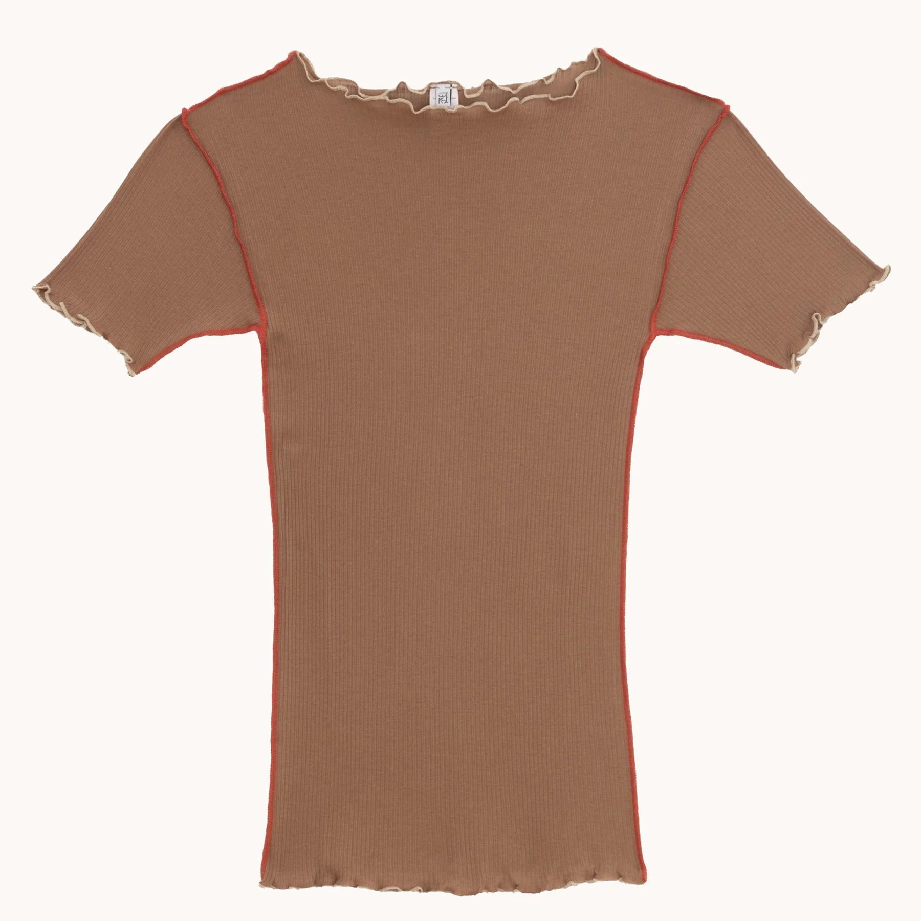 Vein Tee Shirt in Alamillo & Red is a organic cotton rib tee. A boat-neck silhouette detailed with exposed contrast seams and delicate lettuce edging at the neckline and hem.
