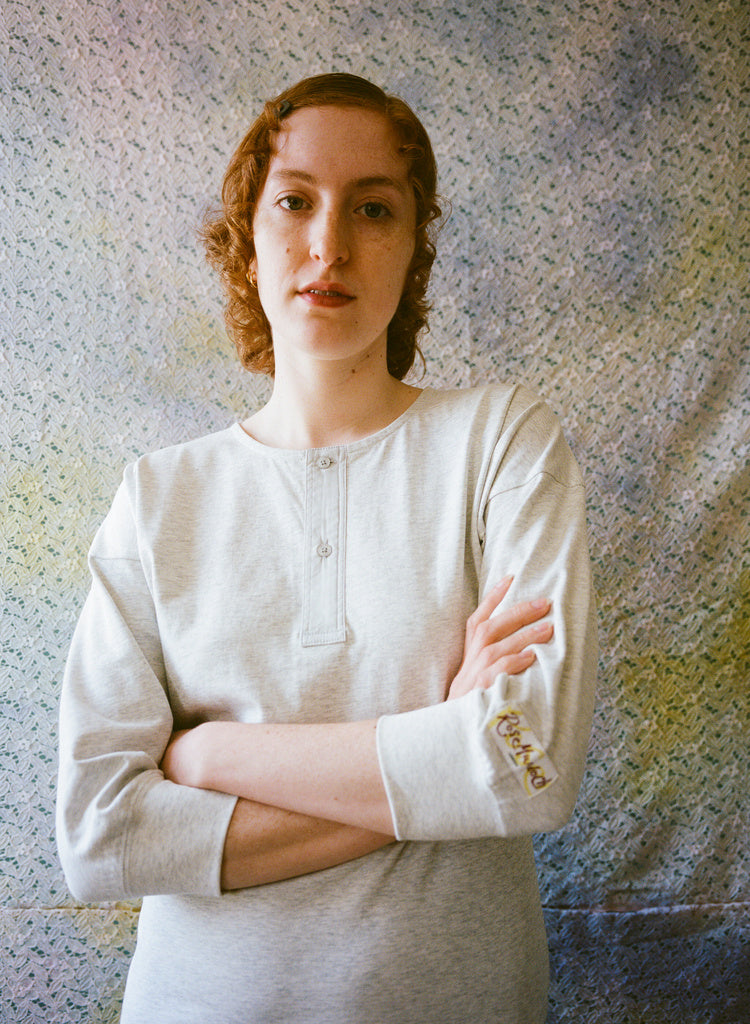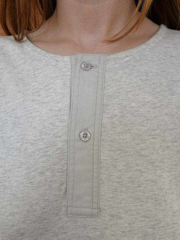Venus Dress in Grey Marl - crafted from soft cotton jersey in a versatile Grey Marl, this mini dress features a classic henley placket and ribbed cuffs for a touch of structure. A subtle Rose Murdoch logo on the sleeve adds signature charm. Sweet, simple, and made for easy dressing