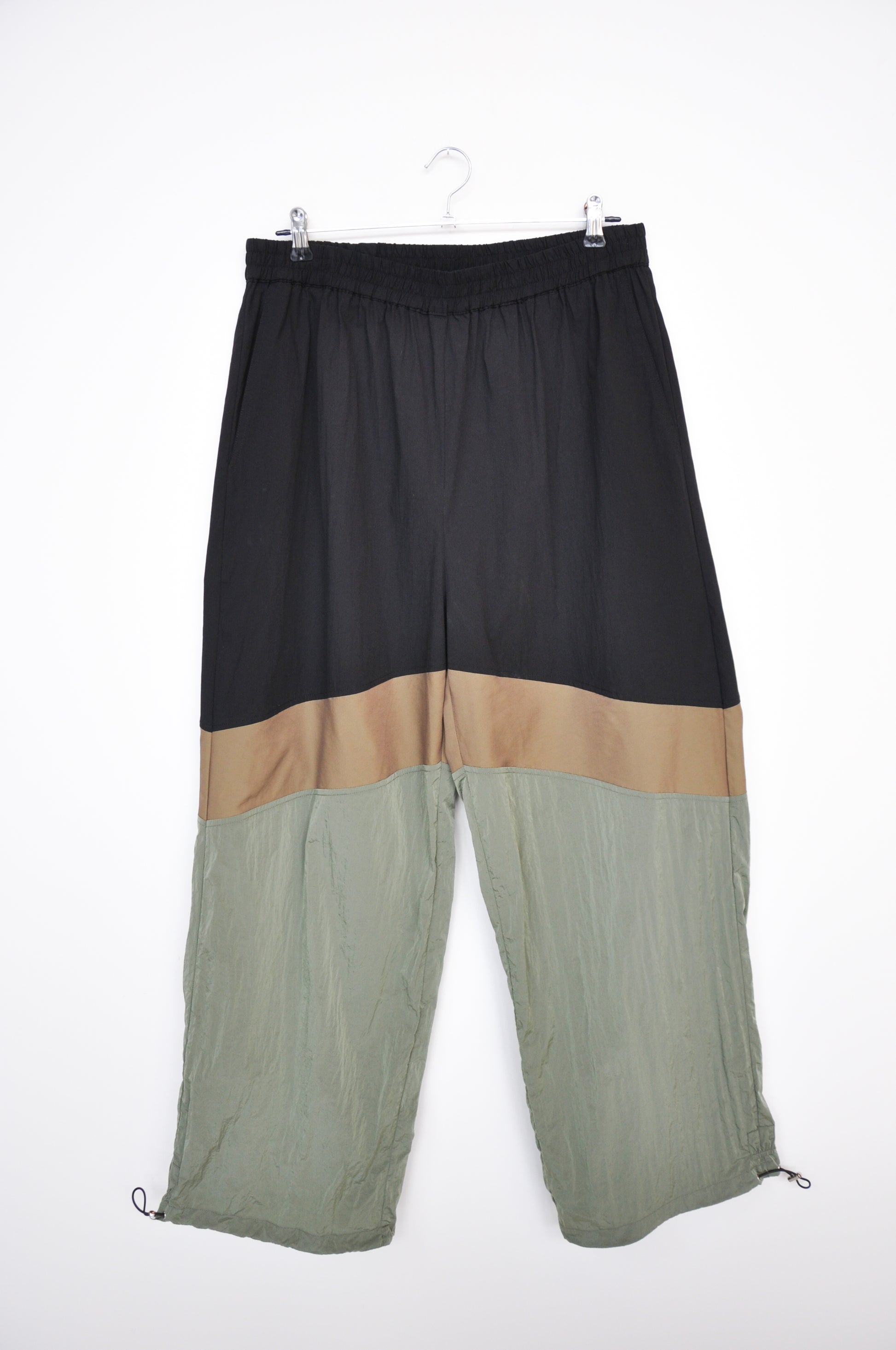 Straight-leg crinkled double gauze track pants. Paneled construction. Elasticized waistband. Two-pocket styling. Bungee-style drawstring at the cuff. By the Wynn Hamlyn.