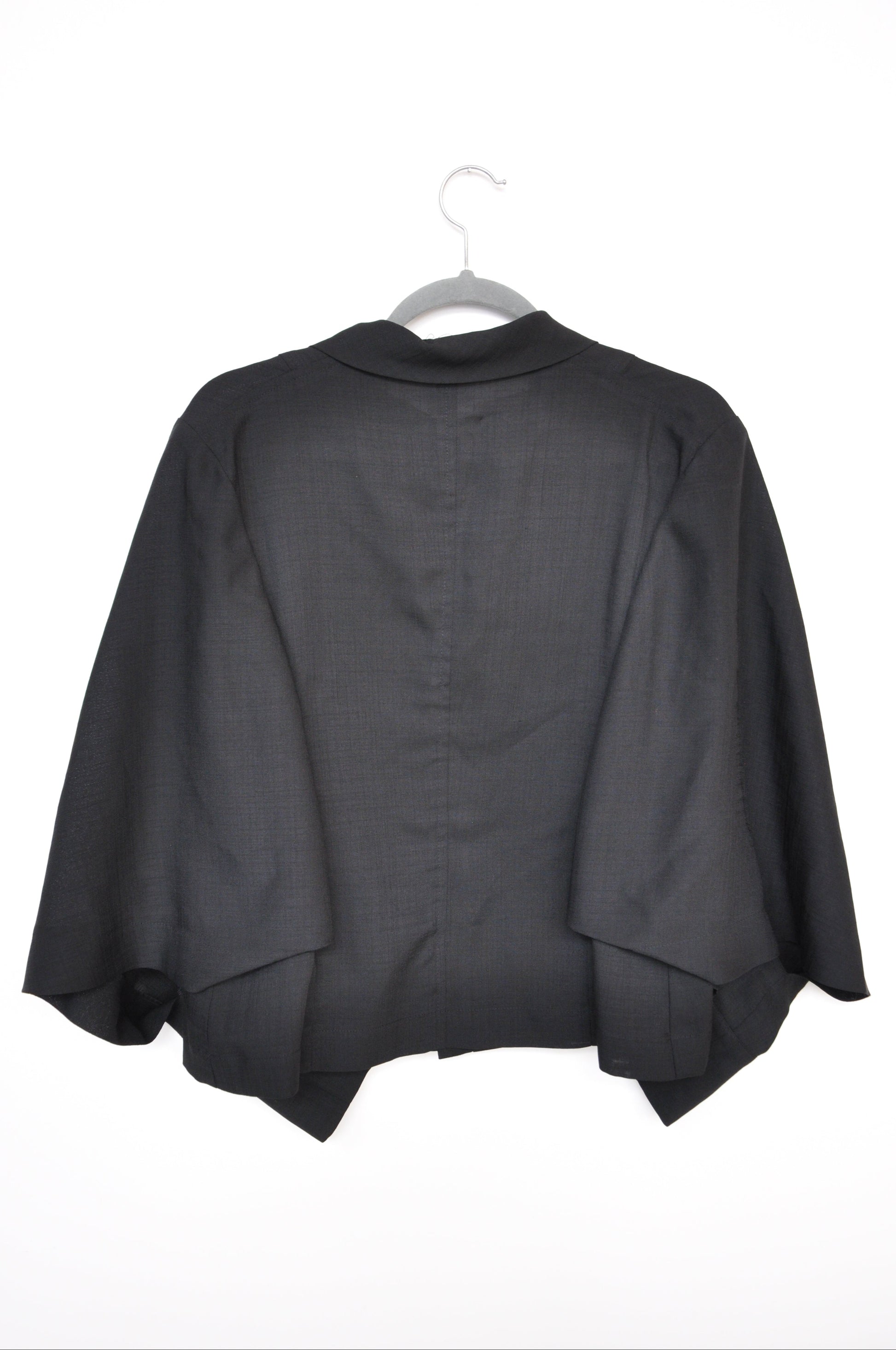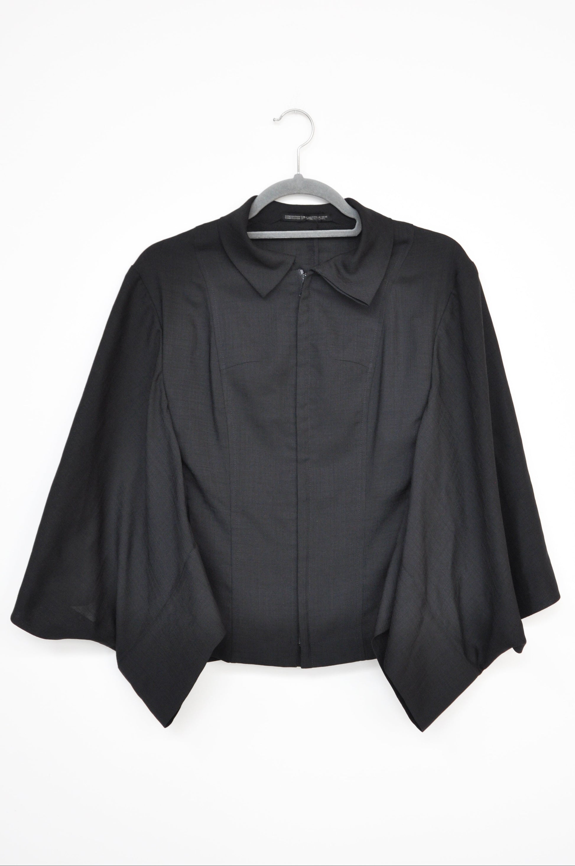 Short Sleeved jacket with a collar. It features wide, flowing sleeves. Relaxed fit. Invisible zip closure. two front pockets. By the brand Yohji Yamamoto.