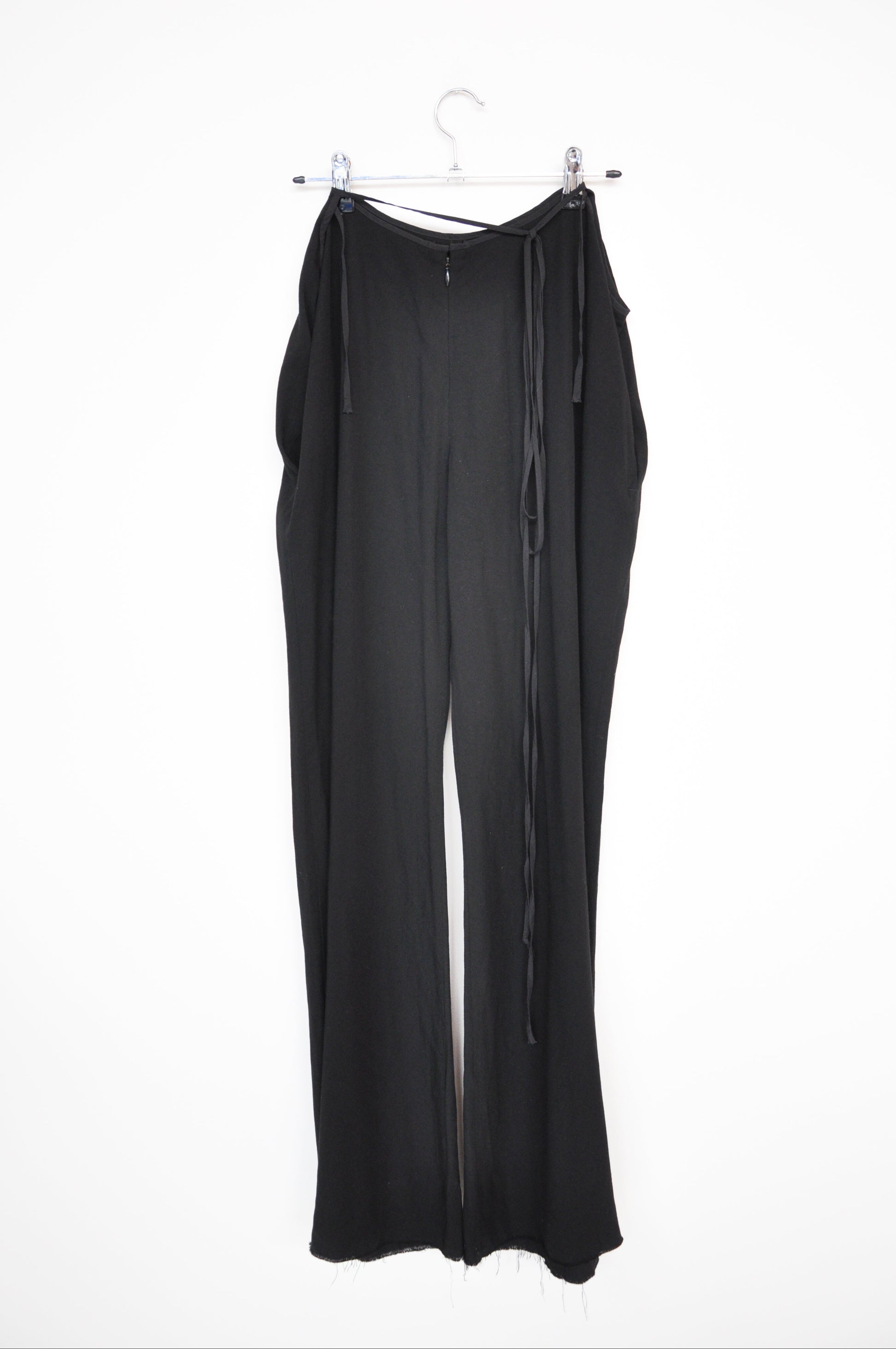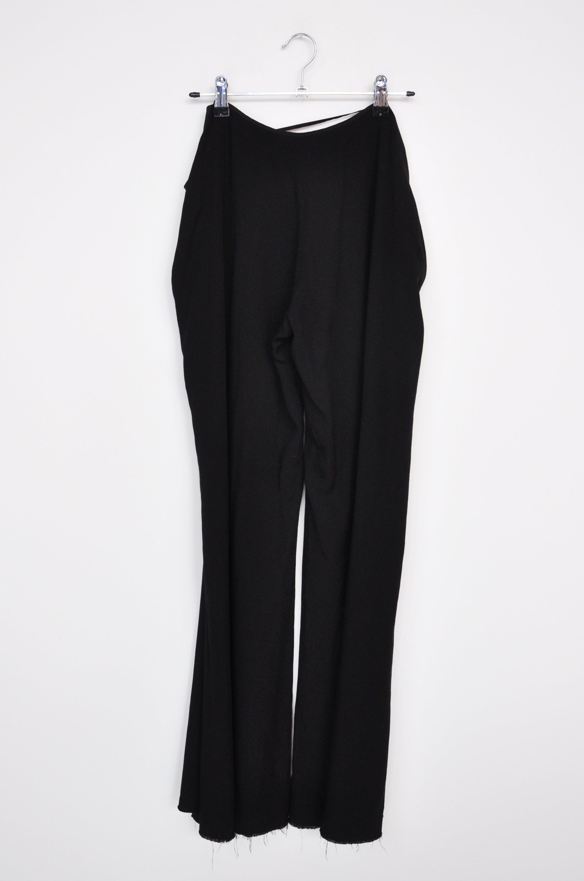 A lightweight trouser in a wide-legged style. This trouser has an asymmetrical tie detail at the top of the waistband, which forms two cutouts at the hip. Includes an invisible zip closure and a raw hem at bottom of the trouser. By the brand Yoji Yamamoto in a 3.